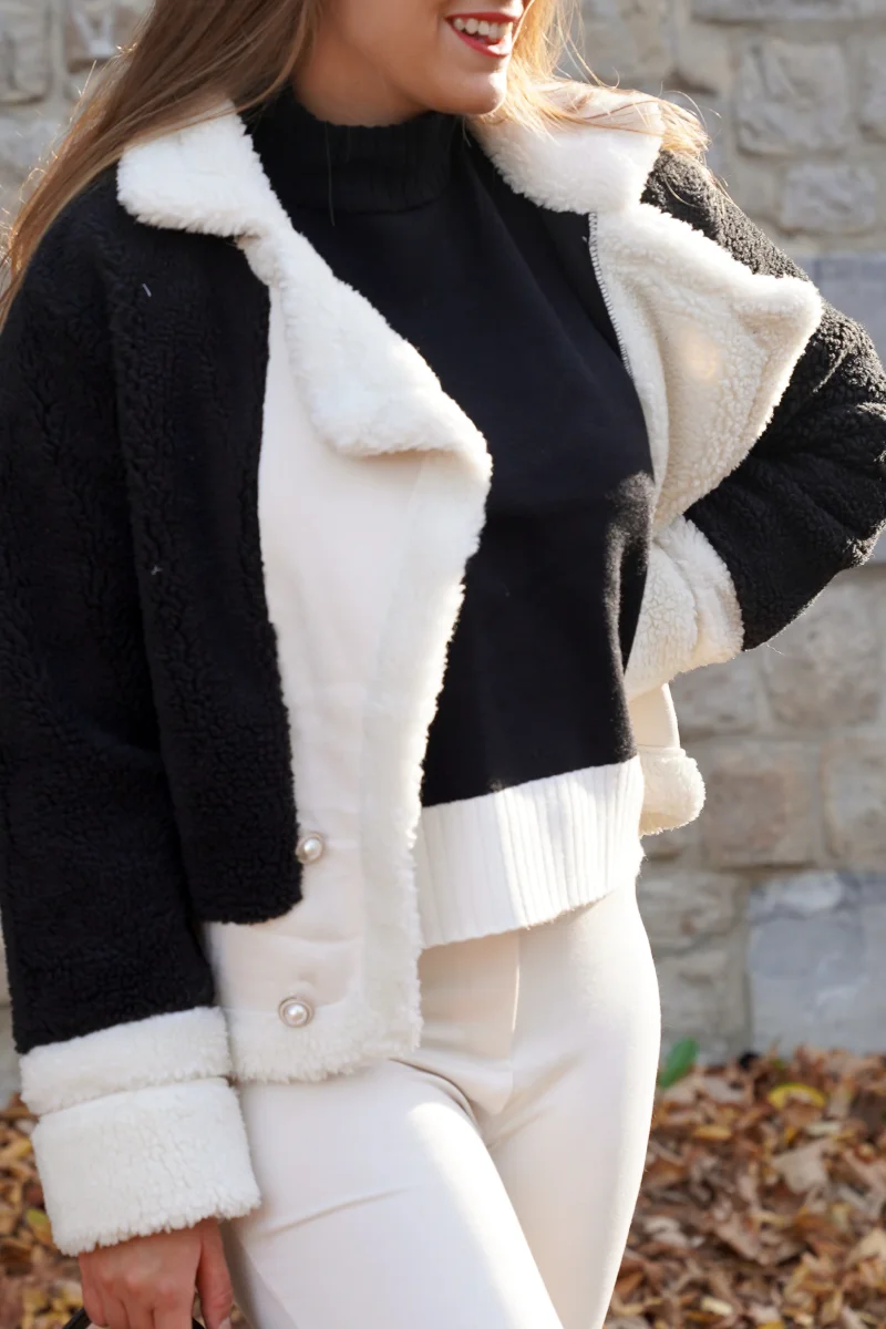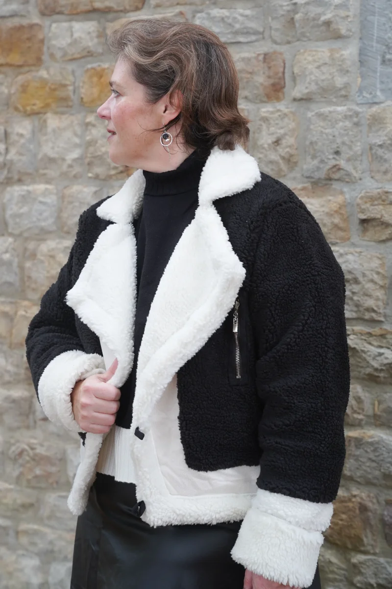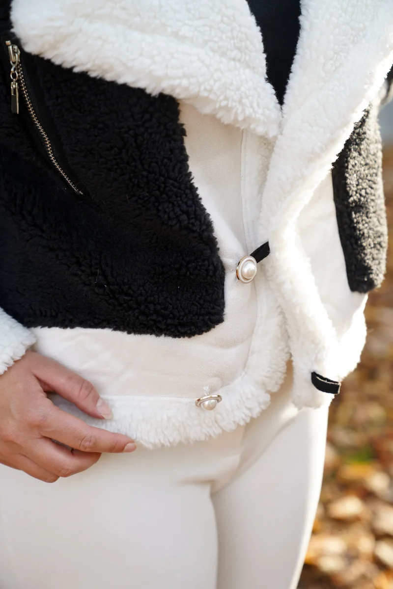 En petite et grande taille En teddy bi-color Fermeture par 2 boutons en nacre Légère, chaude, extra douce Existe en gris et blanc