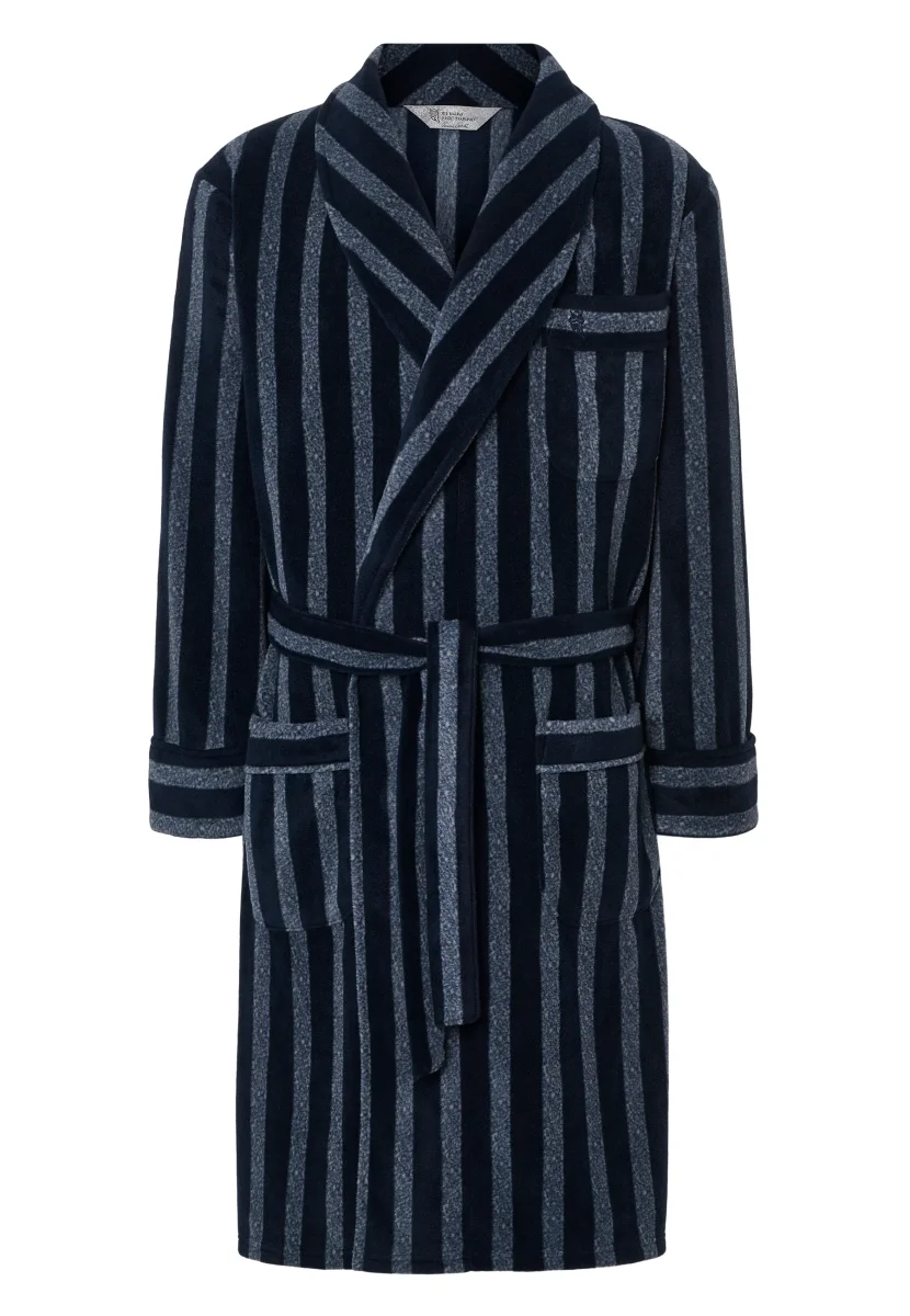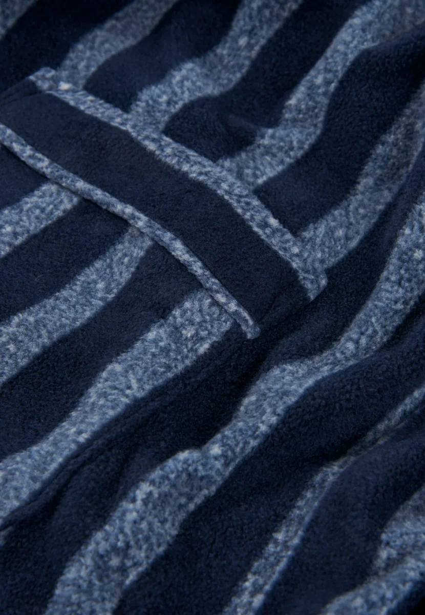 Bata premium de hombre de manga larga ideal para el frío invierno de tejido en forro polar, 100% poliéster de gran peso en 260g/m2. Edición « The Gentlemen’s Choice », serie premium de alta calidad. Color marino con rayas gris melange. Logo bordado en el pecho. Bata agradable al tacto y extremadamente abrigada. Cómoda, suave y aporta confort en todo el cuerpo. Con cinturón para ajustar la cintura. Con tres bolsillos, uno en el pecho y otros dos a ambos lados de la cadera.