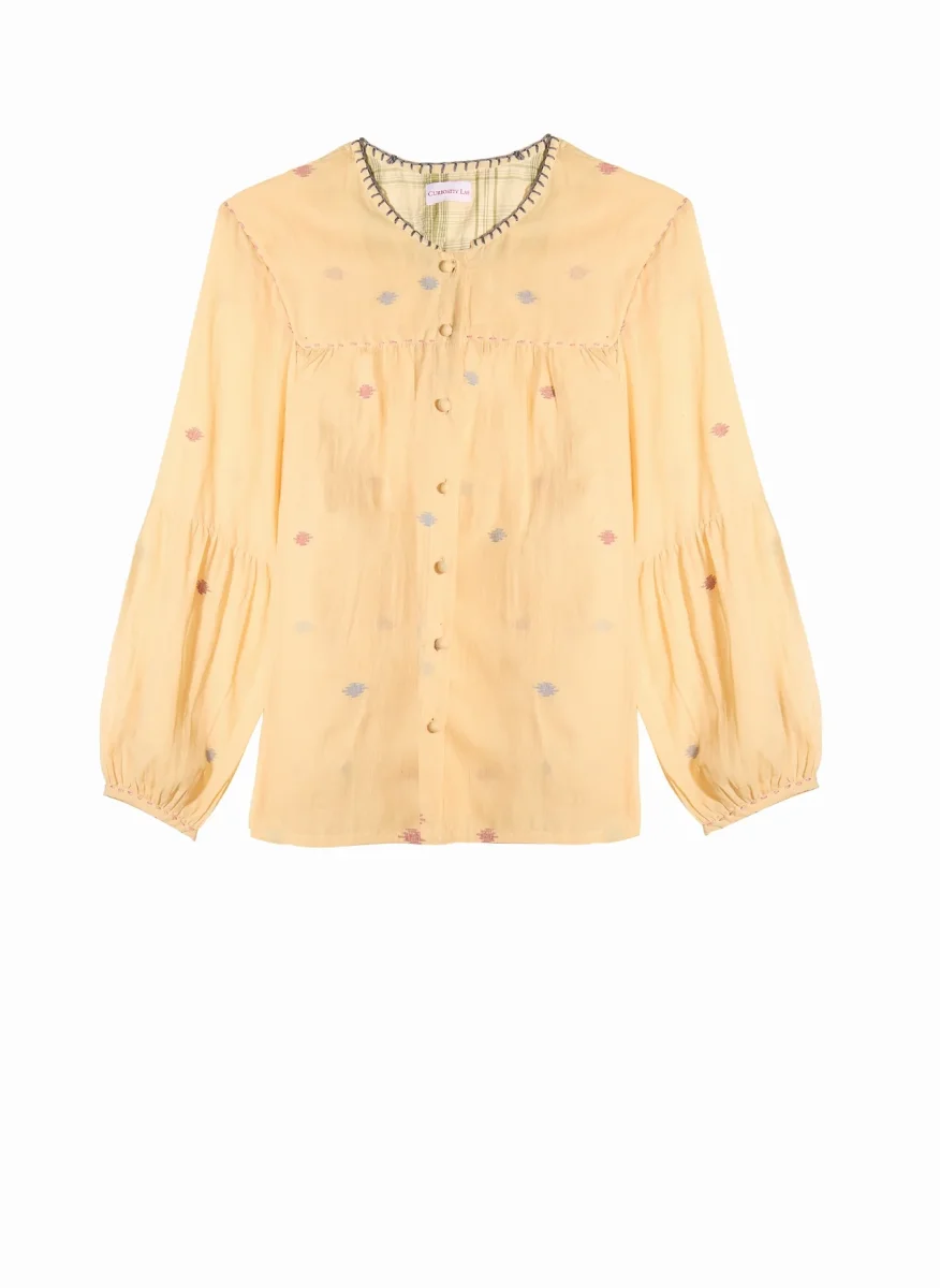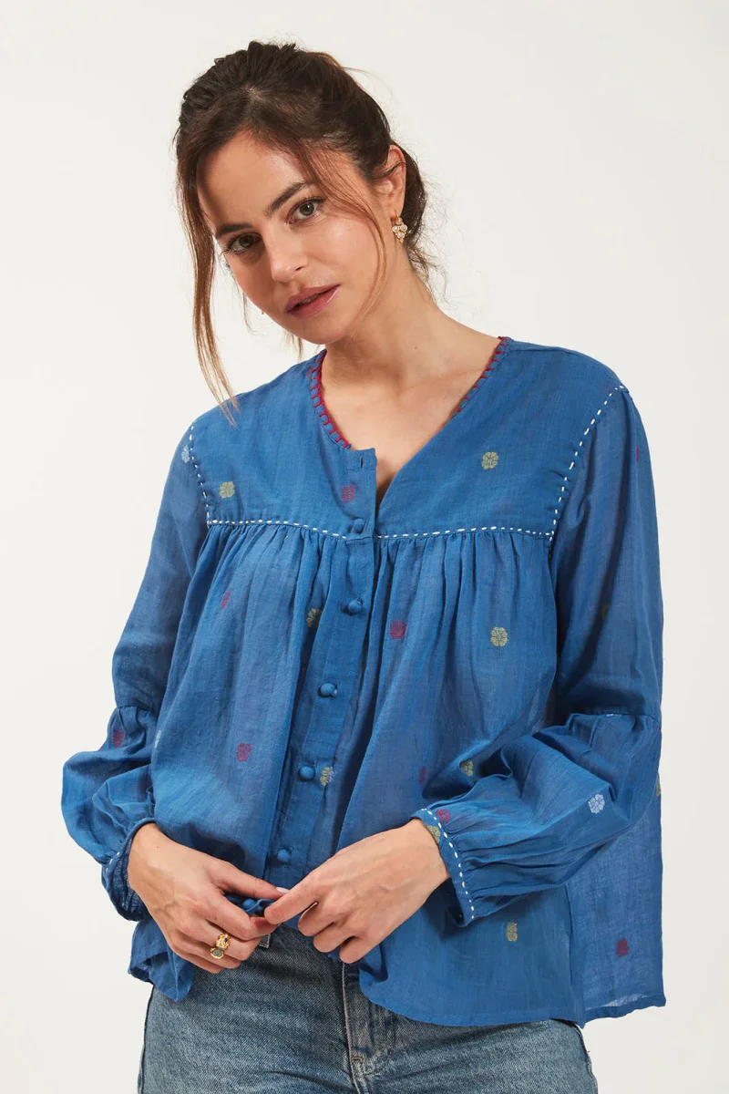Confectionnée en jamdani, coton doux et vaporeux tissé à la main, cette blouse est le fruit du savoir-faire ancestral des artisans de la plaine indienne.