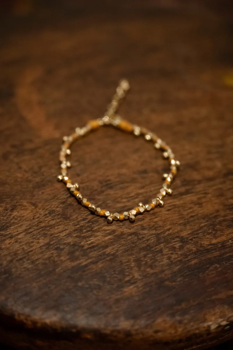 Ce joli bracelet Amber est le parfait accessoire pour compléter votre style féminin ! Fait à partir de laiton et de fil de coton, il est fin et élégant, orné de perles dorées qui apportent éclat et brillance. Longueur 19cm. Les retours se font sous 15 jours.
