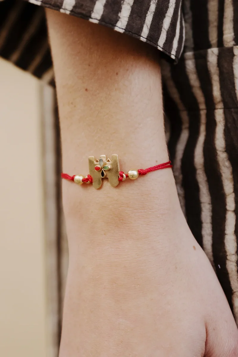 Elégant et discret, craquez pour ce bracelet amulette fait en fil de coton, doré à l’or fin et serti de pierres semi-précieuses. Les retours se font sous 15 jours.