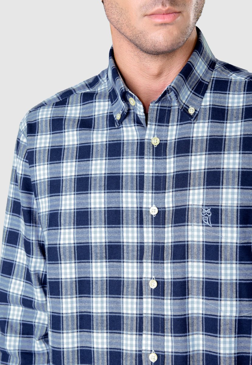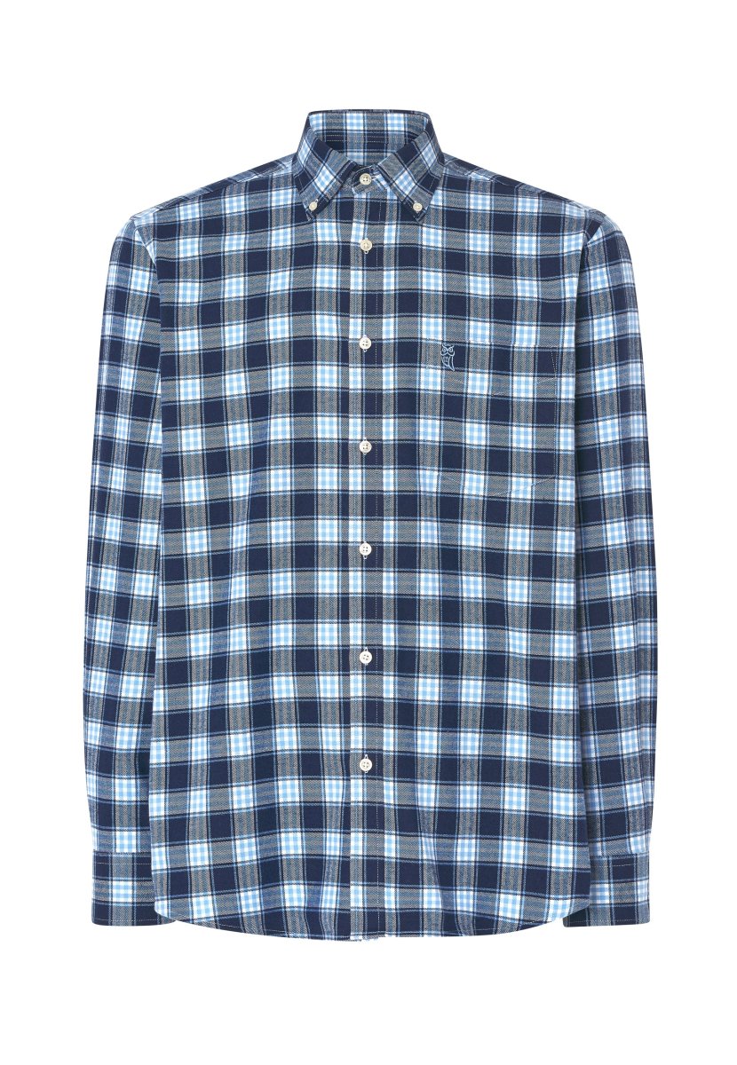 Camisa casual de franela a cuadros de manga larga con bolsillo, apta para entretiempo o invierno. 100% algodón en generosa franela de doble peinado. Edición « Essentials ». Color azul a cuadros marino y blancos con cuello button down. Logo bordado en el pecho. Camisa indispensable en cualquier armario de caballero para invierno, prenda de vestir casual que proporciona comodidad, suavidad y confort. Abrigada y agradable al tacto. Puños con cierre de botón.
