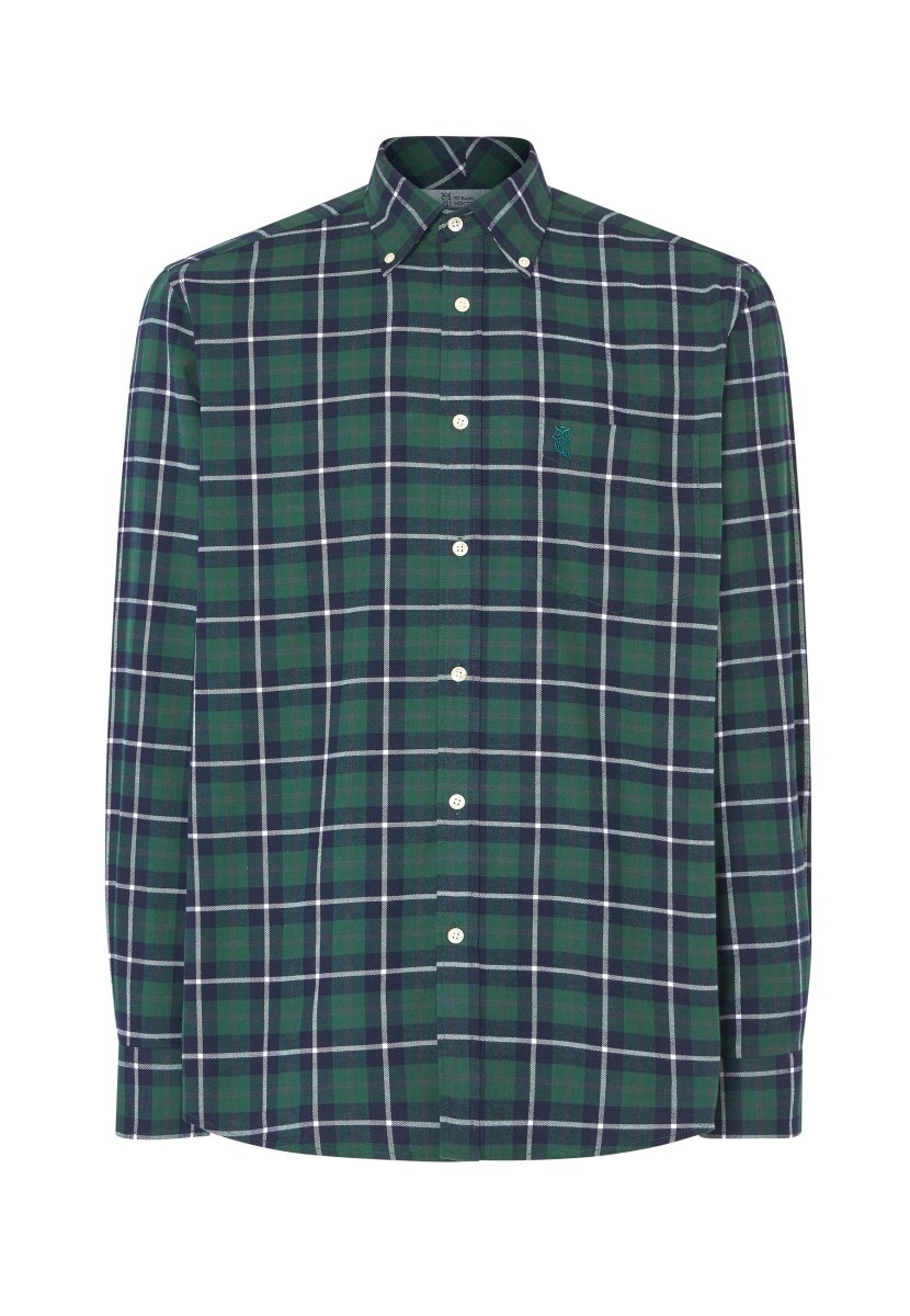 Camisa casual de franela a cuadros de manga larga con bolsillo, apta para entretiempo o invierno. 100% algodón en generosa franela de doble peinado. Edición « Essentials ». Color verde a cuadros delimitados por rayas de color marino y blancas con cuello button down. Logo bordado en el pecho. Camisa indispensable en cualquier armario de caballero para invierno, prenda de vestir casual que proporciona comodidad, suavidad y confort. Abrigada y agradable al tacto. Puños con cierre de botón.