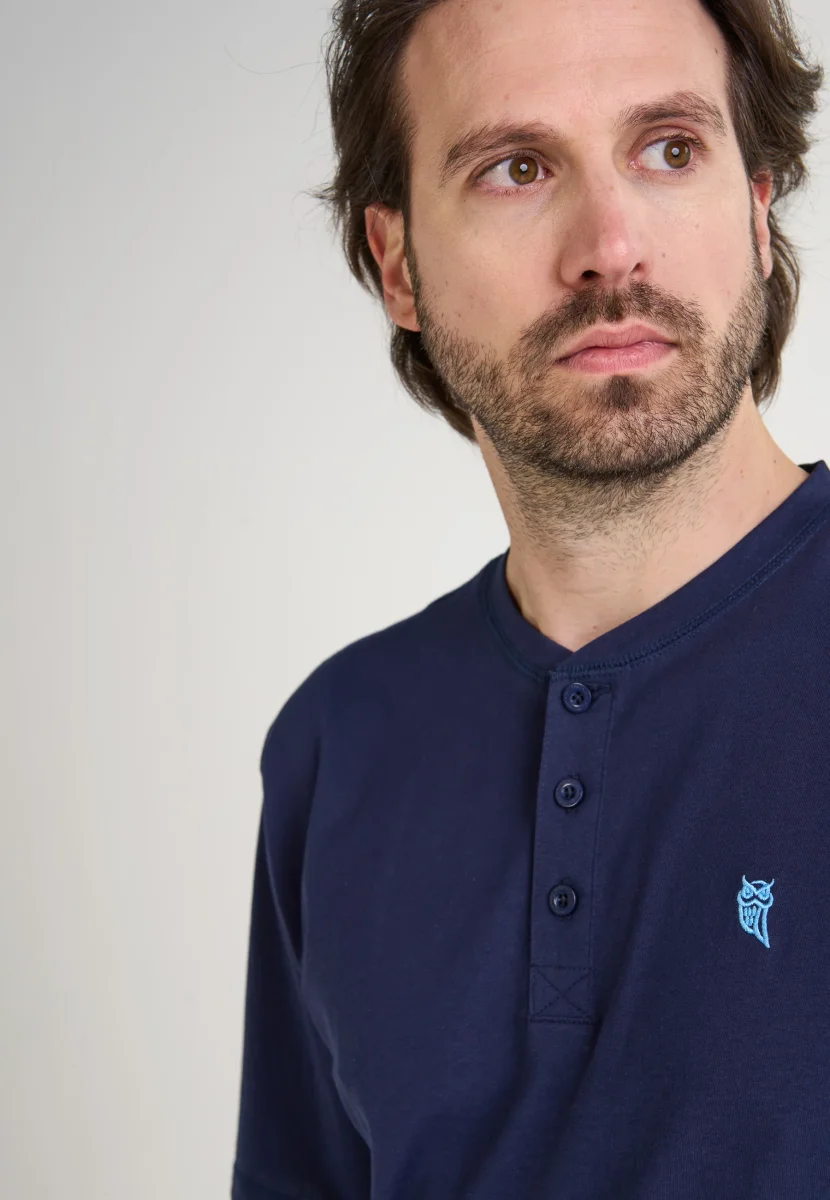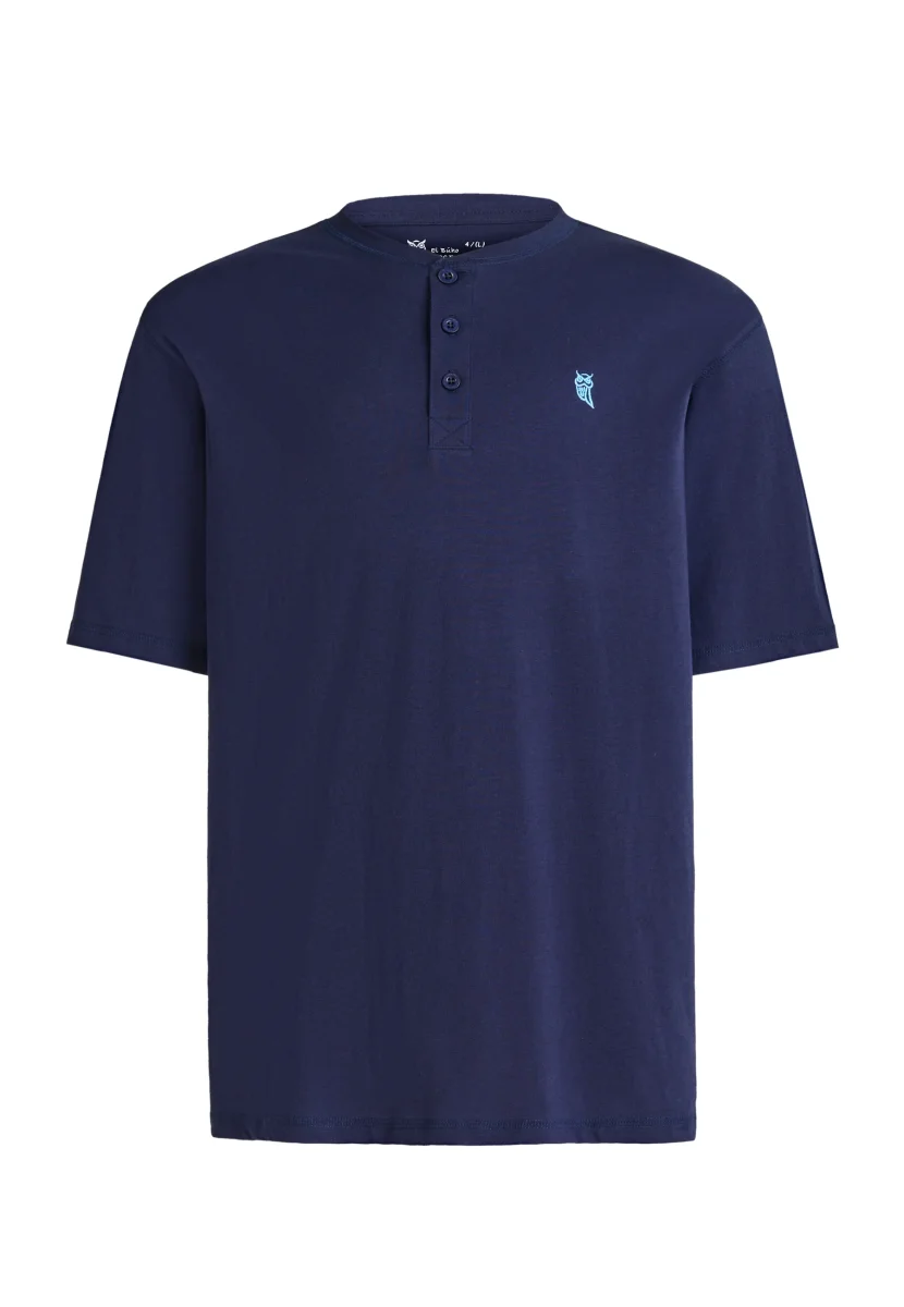 Camiseta básica lisa de manga corta de entretiempo de punto, 100% algodón en 160gr/sqm. Edición « Essentials ». Color azul marino con cuello tapeta a tres botones personalizados a juego. Logo bordado en el pecho. Camiseta multiuso, para interior como exterior, que proporciona comodidad, suavidad y confort. Fresca, agradable al tacto y absorbente.