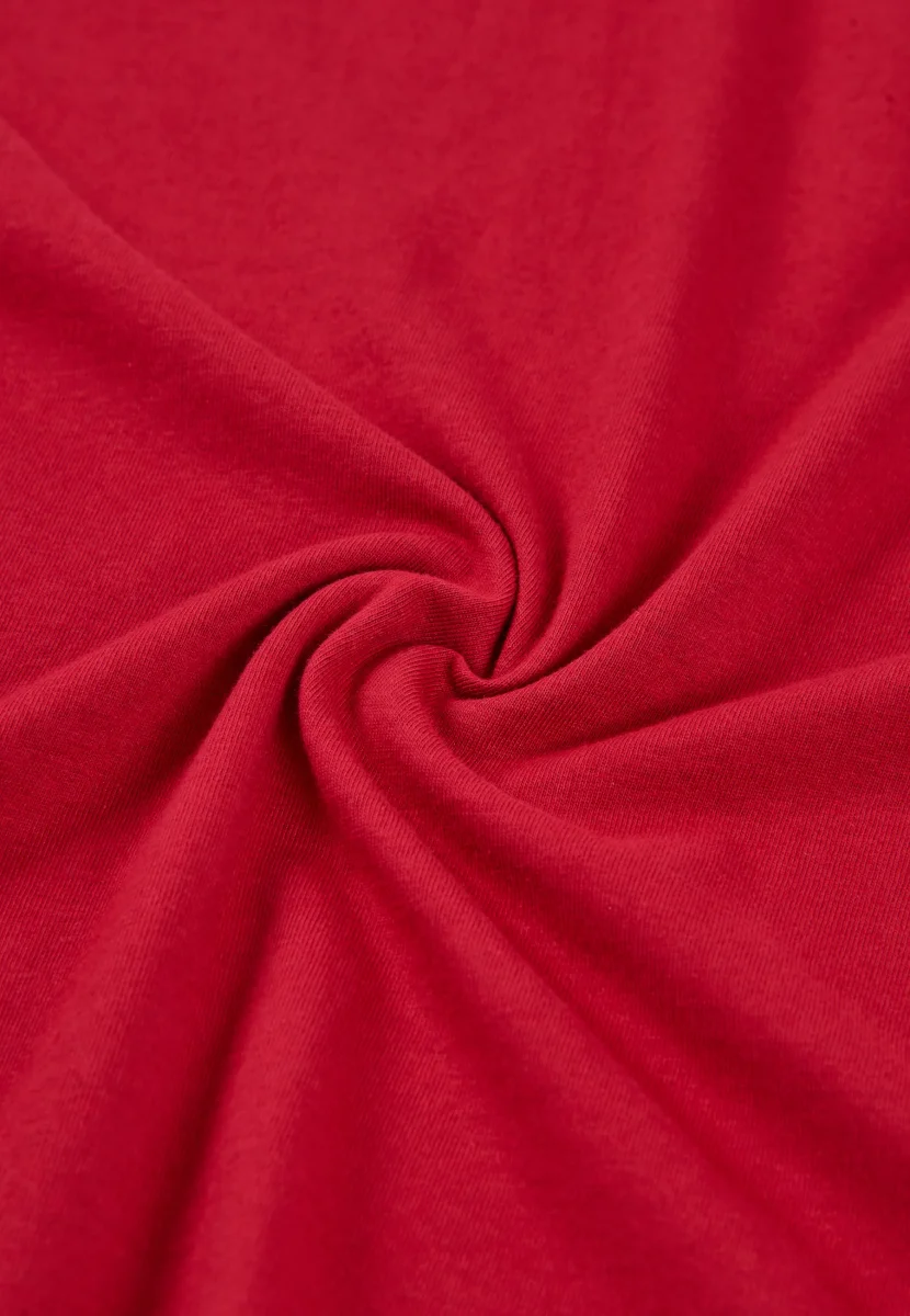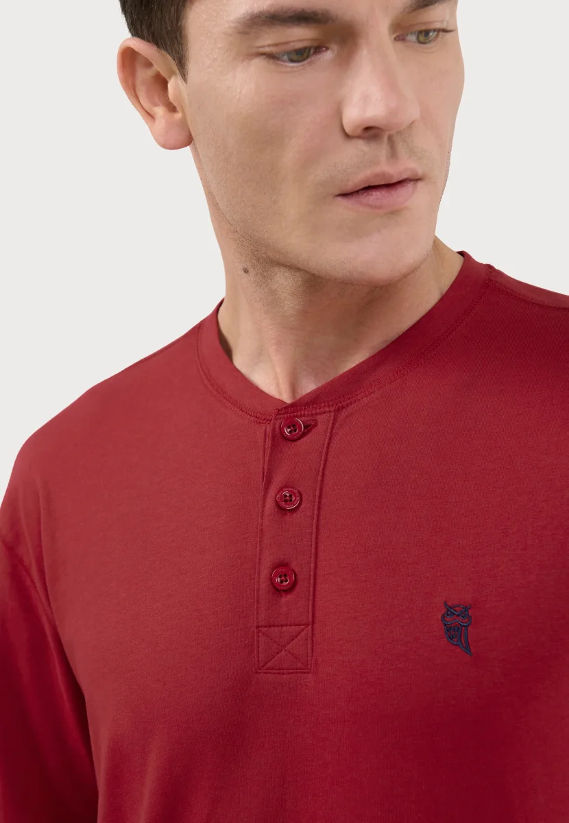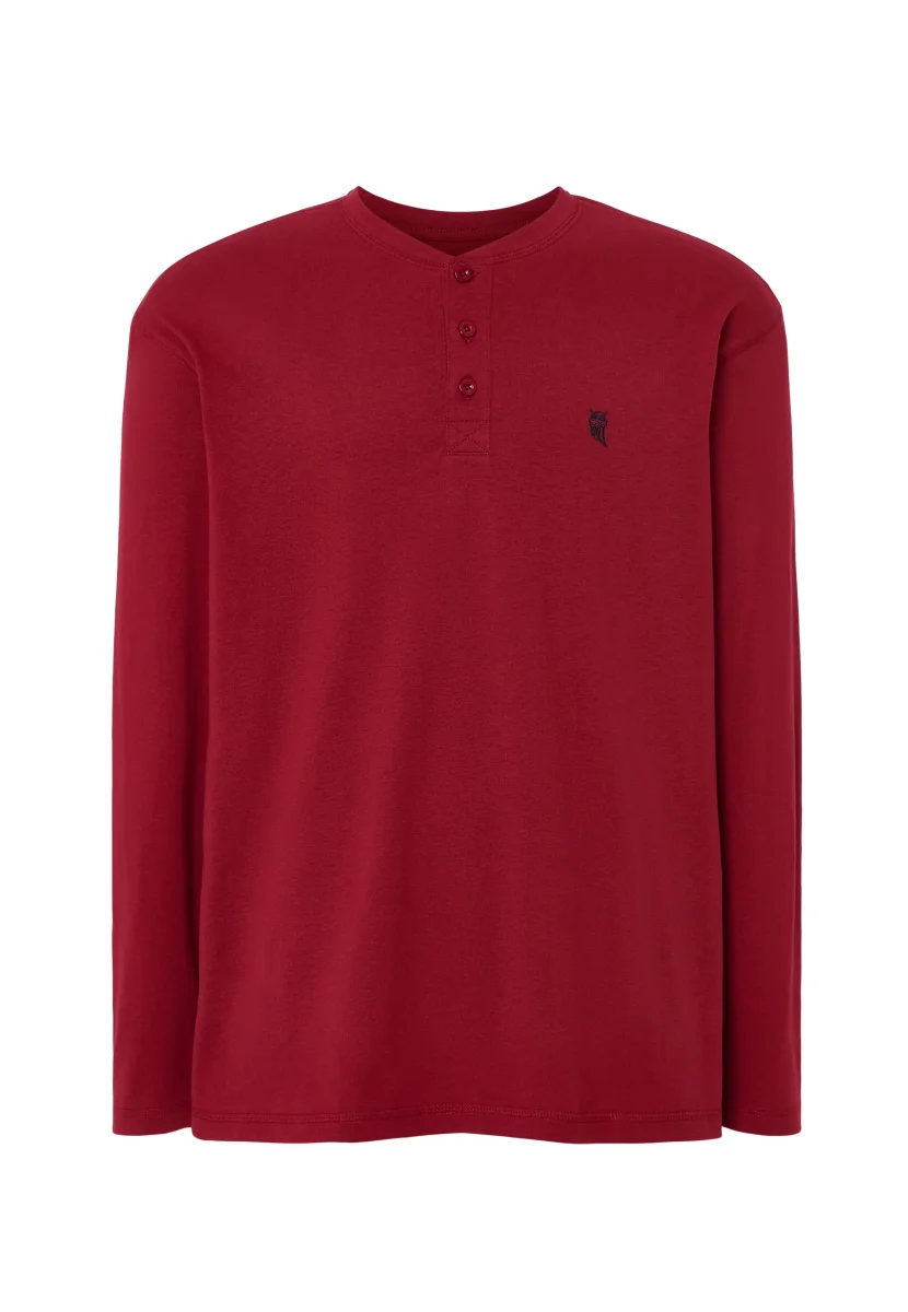 Camiseta básica lisa de manga larga de punto, 100% algodón. Edición « Essentials ». Color burdeos con cuello tapeta a tres botones personalizados. Logo bordado en el pecho. Camiseta multiuso cómoda tanto para interior como exterior. Fresca, agradable al tacto y absorbente.