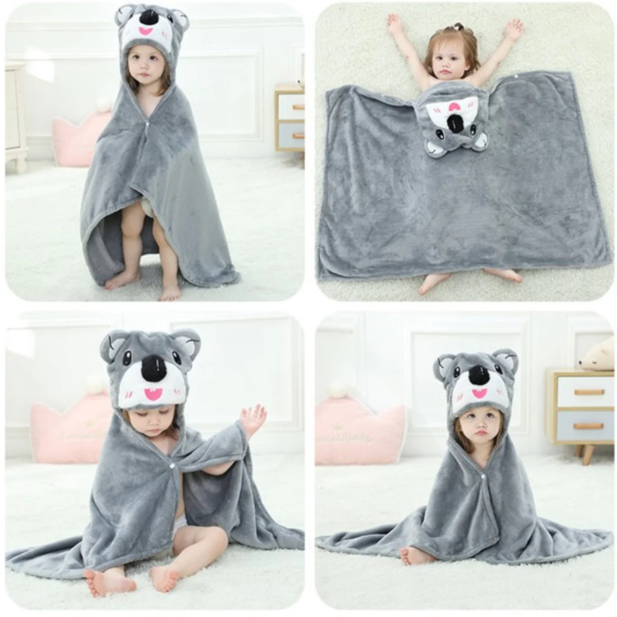 Cette cape de bain grise pour bébé est douce et moelleuse, enveloppant délicatement l’enfant après le bain. Sa capuche, ornée d’une mignonne tête de koala, ajoute une touche ludique. La couleur neutre apporte une élégance discrète, tandis que la capuche en forme de tête de koala ajoute une note adorable. Fabriquée avec des matériaux de qualité, cette cape est à la fois douce pour la peau délicate de bébé et facile à entretenir. Un essentiel charmant et pratique pour les moments de tendresse après le bain.