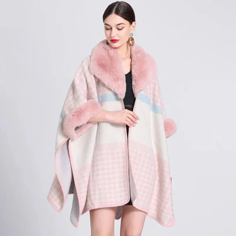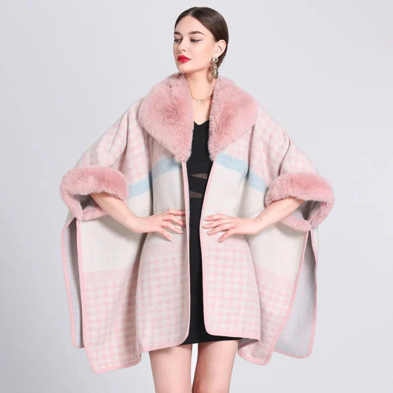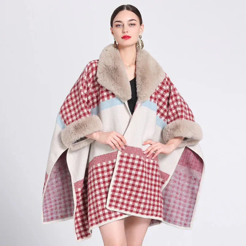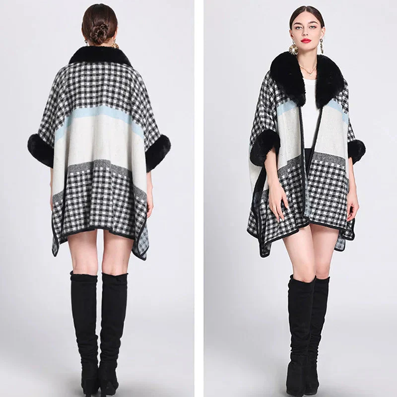 Cape chic pour femme à petits carreaux et col fausse fourrure
