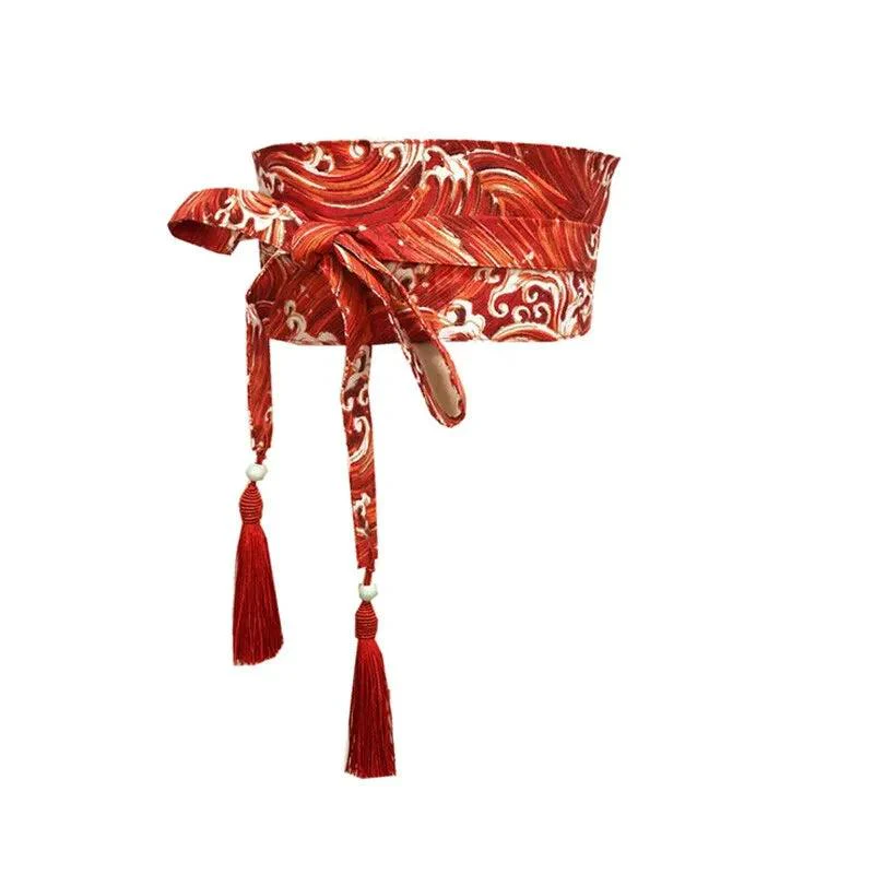 Découvrez cette magnifique ceinture large d’inspiration japonaise, idéale pour sublimer vos tenues avec élégance et originalité. Confectionnée dans un style obi traditionnel, cette ceinture décorative se distingue par son motif artistique de vagues stylisées dans des tons rouge et or.
