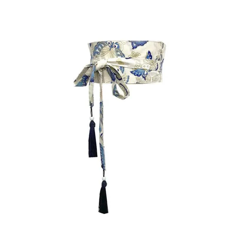 Ceinture Obi Japonaise Bleu et Blanc Floral avec Papillons