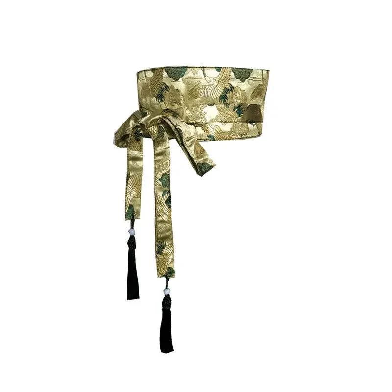 Sublimez vos tenues avec cette magnifique ceinture obi japonaise confectionnée dans un satin doré luxueux. Ornée d’un motif raffiné de grues stylisées dans des tons verts et dorés, cette ceinture large apporte une touche d’élégance traditionnelle asiatique à votre garde-robe.