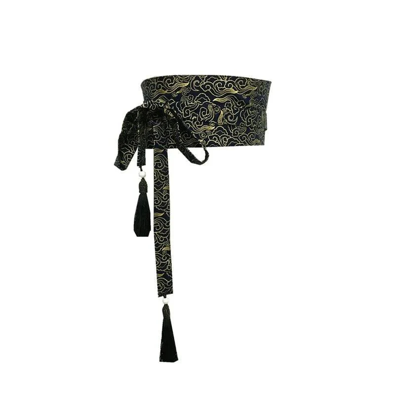 Sublimez vos tenues avec cette magnifique ceinture large de style japonais qui allie tradition et élégance contemporaine. Ornée de motifs de nuages stylisés dorés sur un fond bleu nuit profond, cette ceinture apporte une touche raffinée et originale à toutes vos compositions vestimentaires.