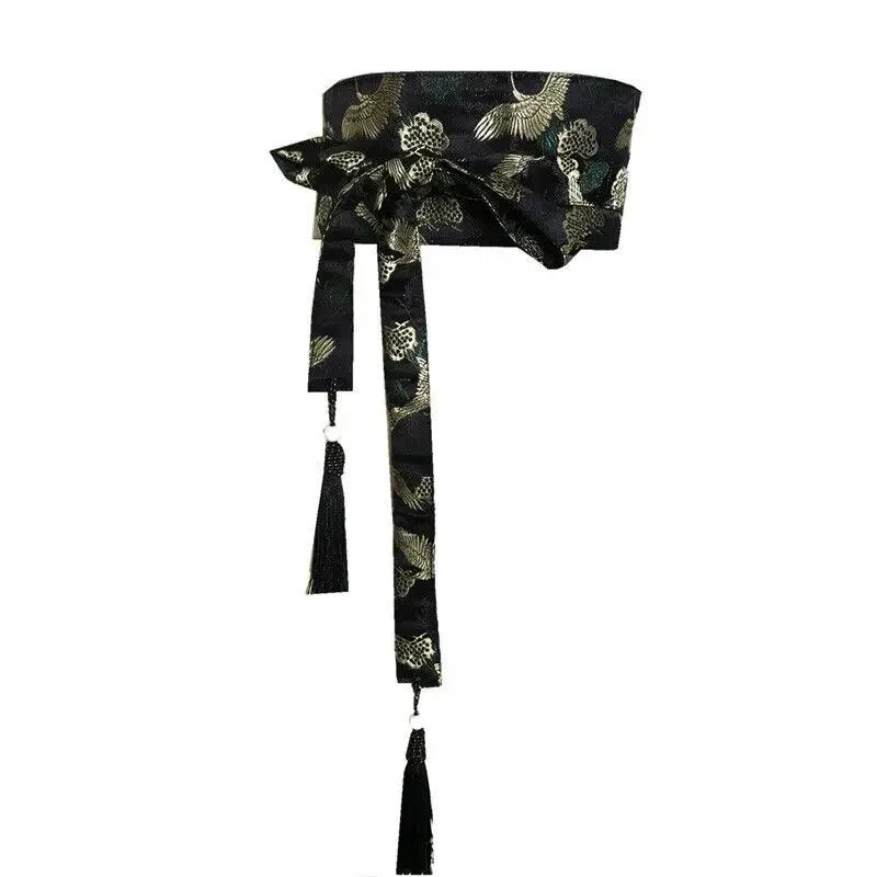 Sublimez vos tenues avec cette magnifique ceinture obi japonaise qui marie élégance traditionnelle et sophistication moderne. Confectionnée dans un tissu noir de haute qualité, elle est ornée d’un délicat motif brodé représentant des grues et fleurs dans des tons dorés et verts, évoquant l’esthétique raffinée du Japon ancestral.