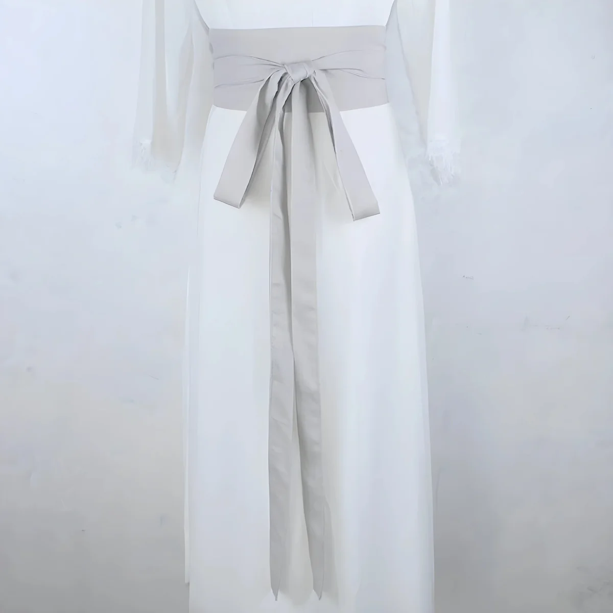 Fabriquée en tissu de qualité légèrement texturé, cette ceinture offre un tombé gracieux et un confort optimal. Sa couleur gris clair neutre s’harmonise parfaitement avec une grande variété de tenues, que ce soit pour un look traditionnel ou contemporain. Le nœud central se forme facilement et ajoute une note sophistiquée à votre silhouette.