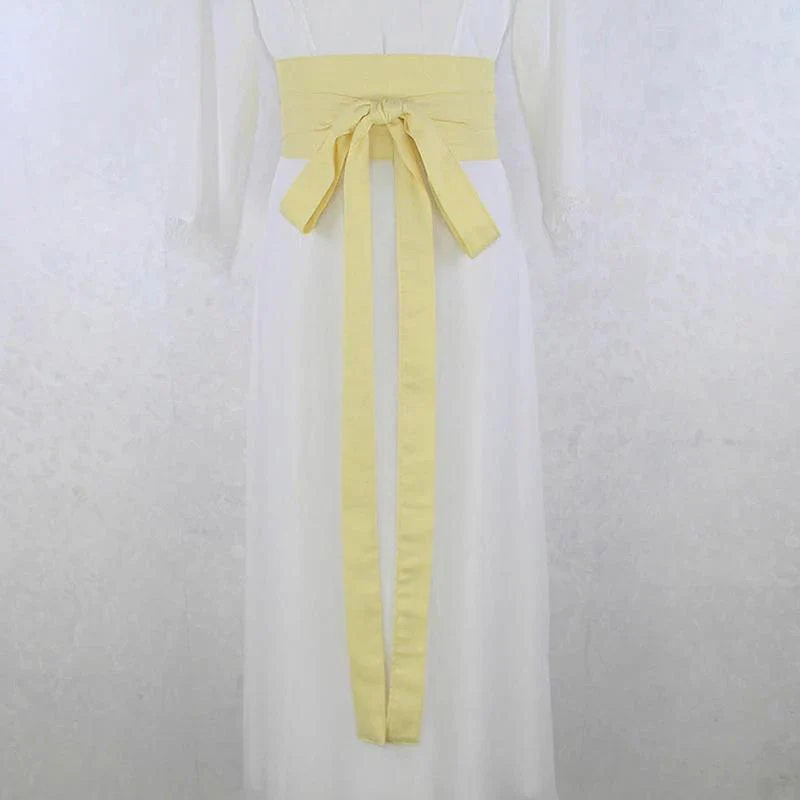 Fabriquée dans un tissu satiné doux au toucher, cette ceinture se distingue par son nœud décoratif élaboré sur le devant, d’où s’échappent deux longs rubans fluides qui subliment la silhouette. Sa couleur jaune pâle lumineuse apporte fraîcheur et élégance, parfaite pour les cérémonies, les événements culturels ou simplement pour adopter un style japonais au quotidien. Découvrez aussi notre ceinture obi rouge brodée avec motifs floraux ou notre ceinture obi bleu marine avec motif floral doré pour varier vos associations.