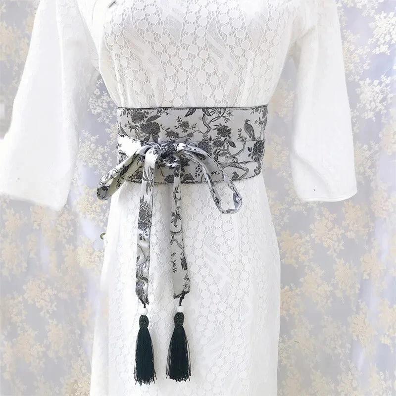 Cette magnifique ceinture obi large apportera une touche d’élégance raffinée à toutes vos tenues. Ornée d’un délicat motif floral avec des oiseaux dans des tons gris et noir sur fond clair, elle s’inspire de l’esthétique japonaise traditionnelle pour créer un accessoire de mode véritablement unique.
