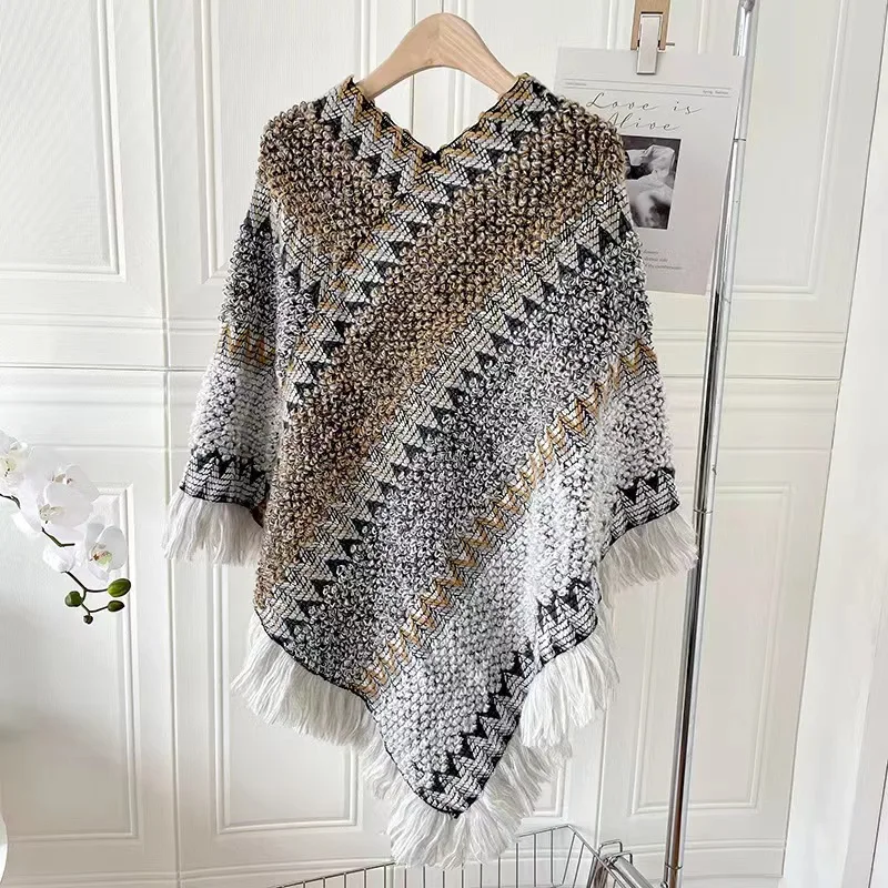 Ce qui fait son charme, c’est vraiment ce patchwork de couleurs et ces motifs géométriques travaillés au crochet. Les franges généreuses sur les bords ajoutent du mouvement, et puis la matière coton, elle est agréable à porter sans gratter. Vous pouvez le draper sur les épaules façon châle classique, ou alors le nouer de différentes manières selon votre style du jour. C’est une pièce polyvalente qui s’adapte, que ce soit sur un pull uni, un manteau ou même une robe.