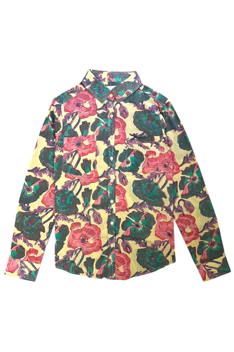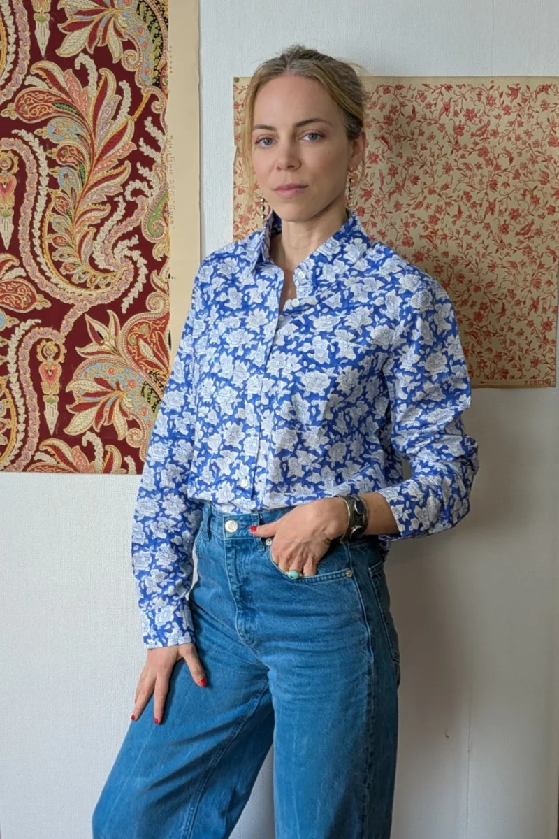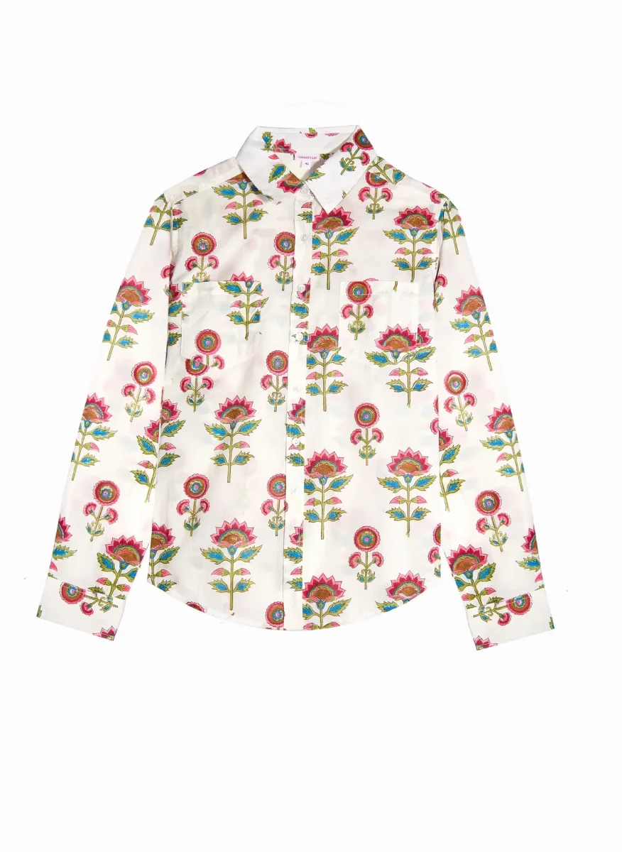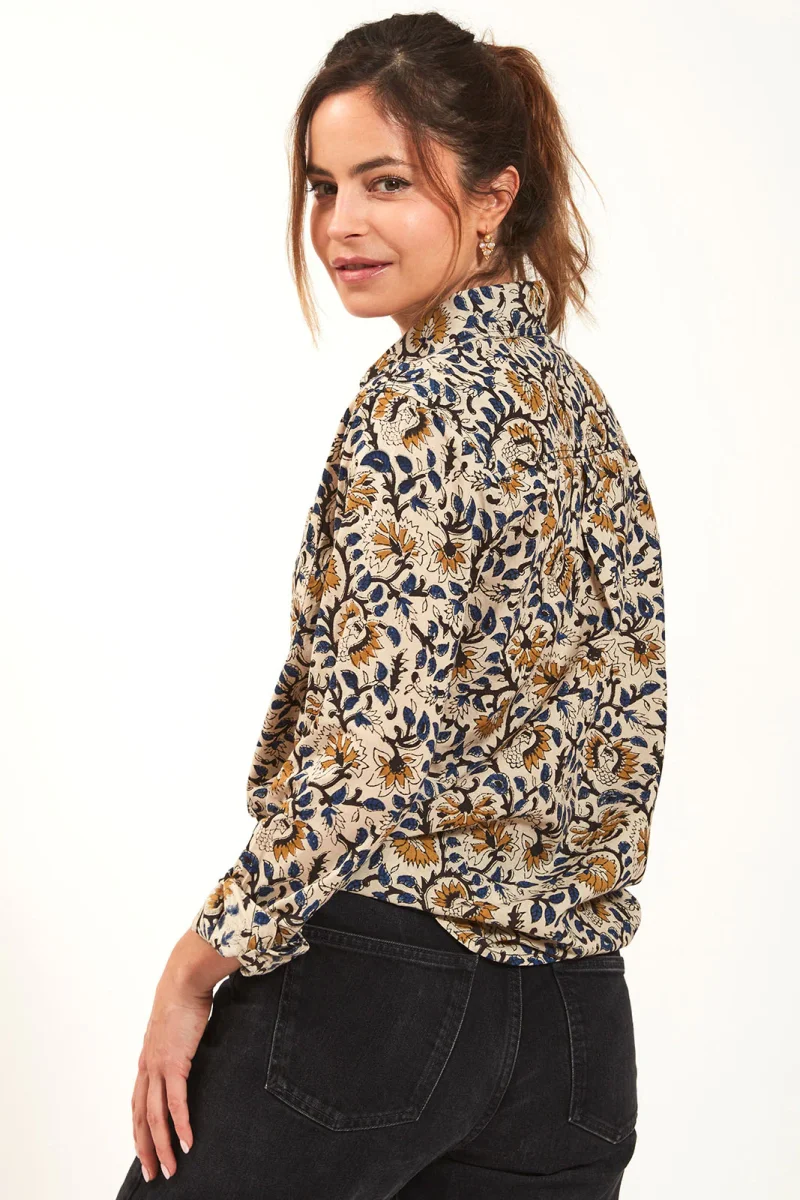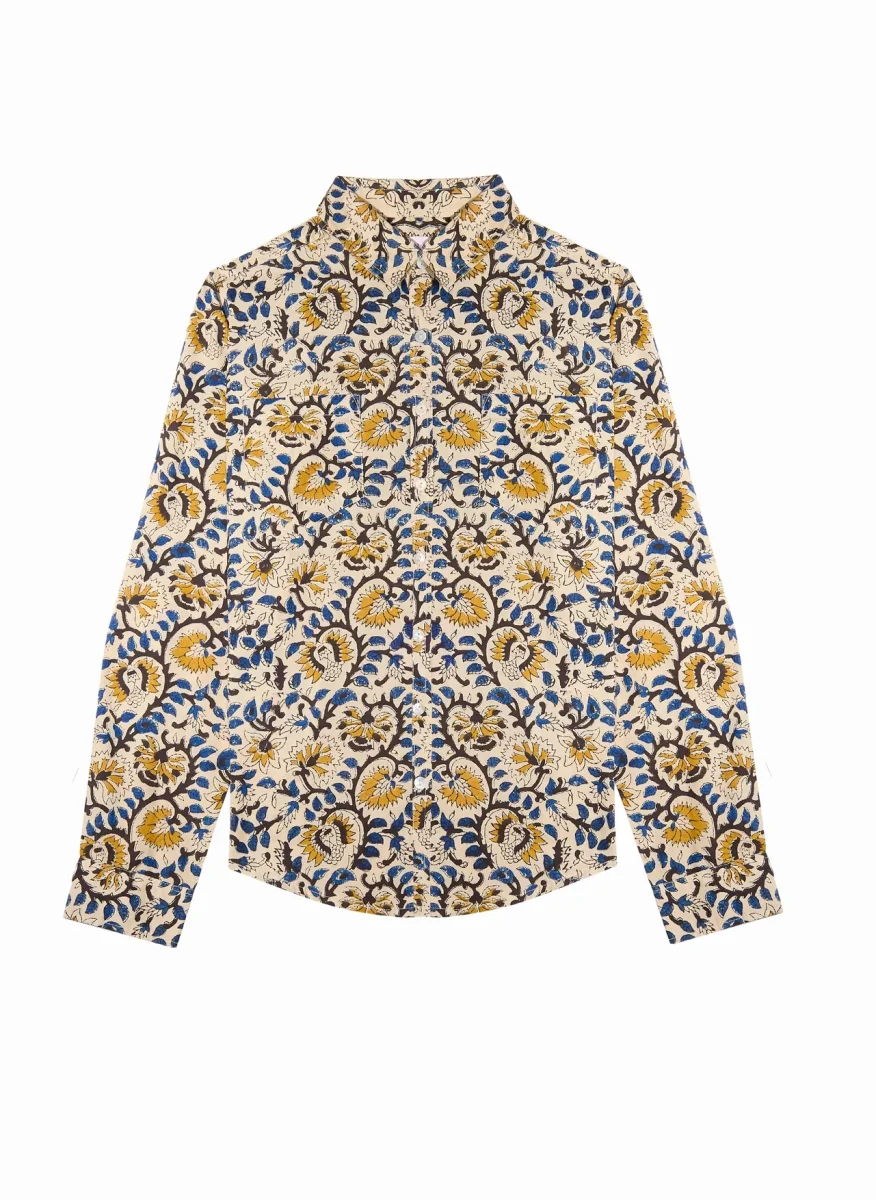 Cette chemise à manches longues et col classique, sublimée par un imprimé réalisé selon la technique traditionnelle du block print, est un must-have de votre garde-robe.