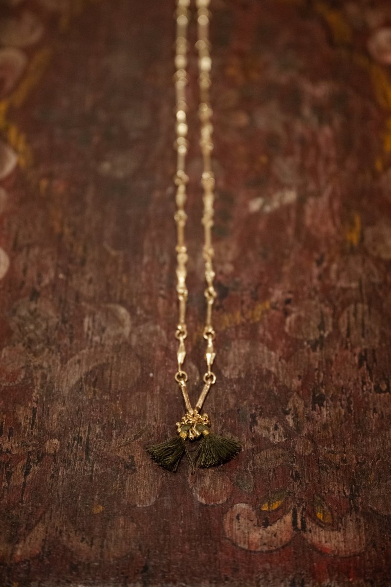 Le Collier Marwari est un collier élégant et fin, fait de laiton et orné d’un pompon coloré en fil de coton.