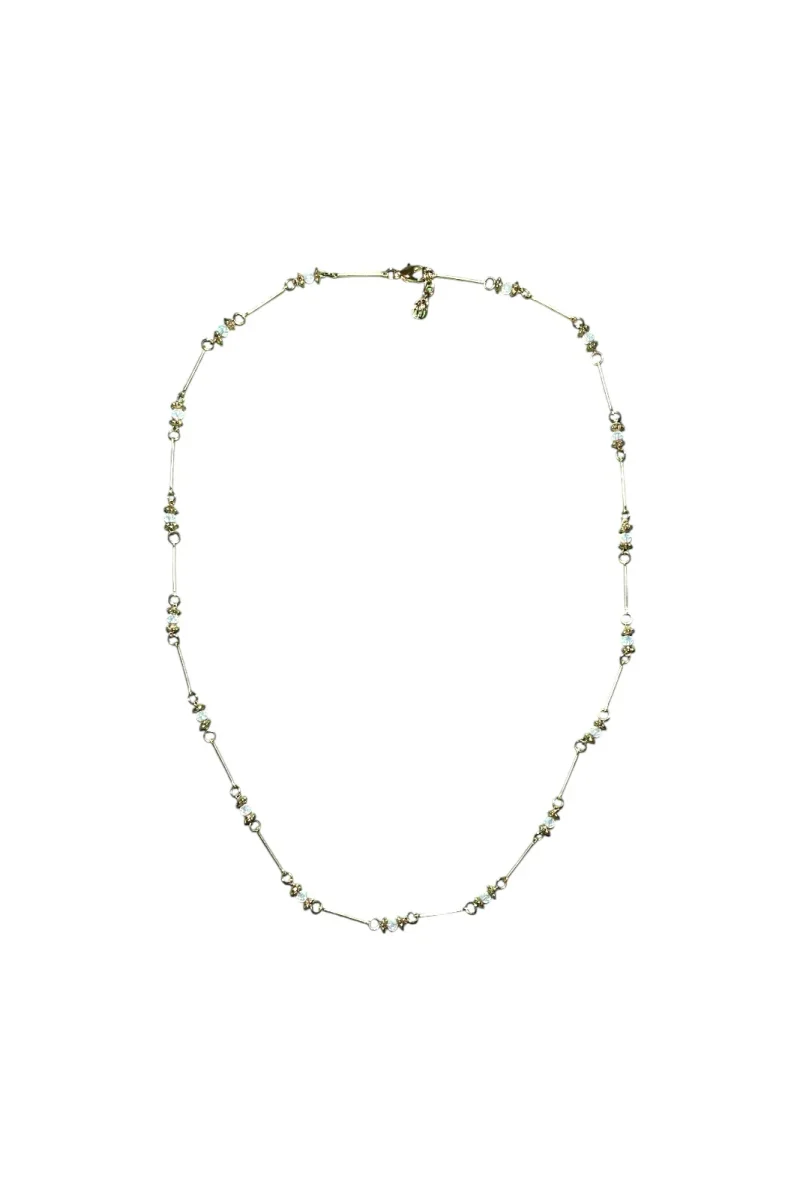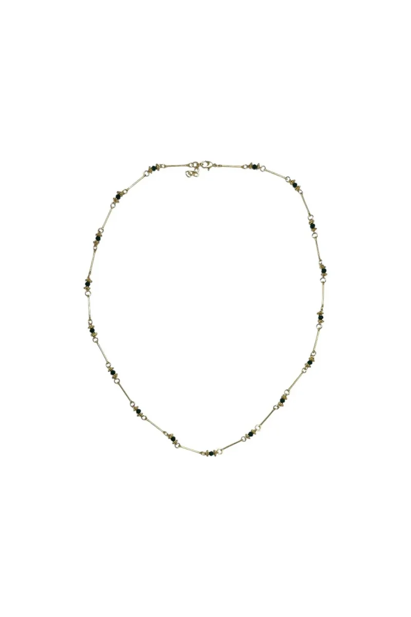 Ce collier présente un design délicat avec des perles finement disposées le long d’une chaîne en laiton doré. Ce collier fait main allie qualité artisanale et style contemporain, et saura compléter aussi bien une tenue de jour qu’un look de soirée.