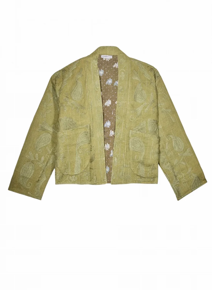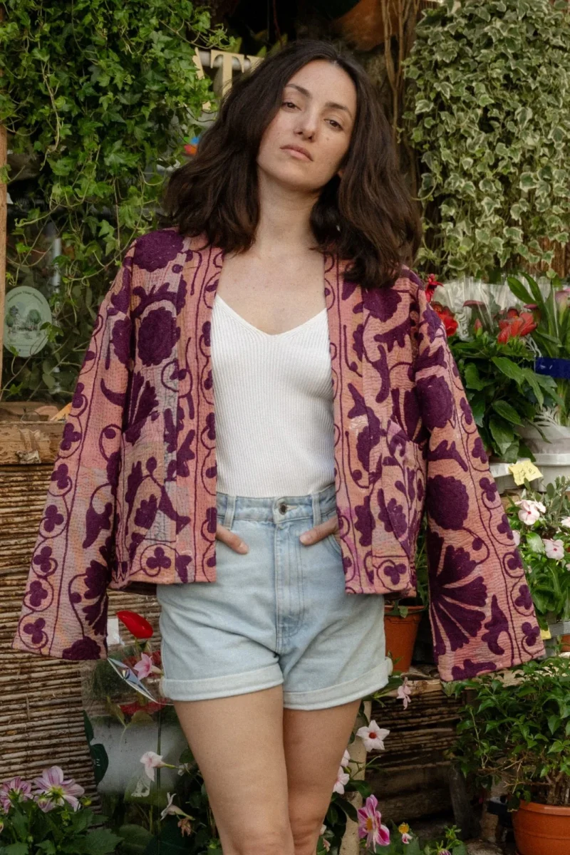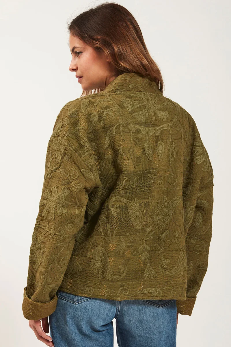 Découvrez notre veste en kantha brodé, doublée en coton un indispensable pour les temps froids. Parfaite pour être portée sur votre robe favorite ou associée à un jean pour un look décontracté, cette veste mi-longue réversible avec manches longues et poches plaquées allie polyvalence et élégance.