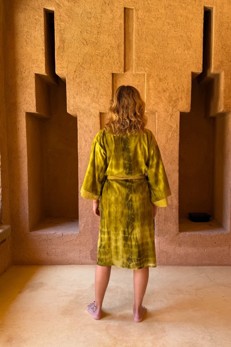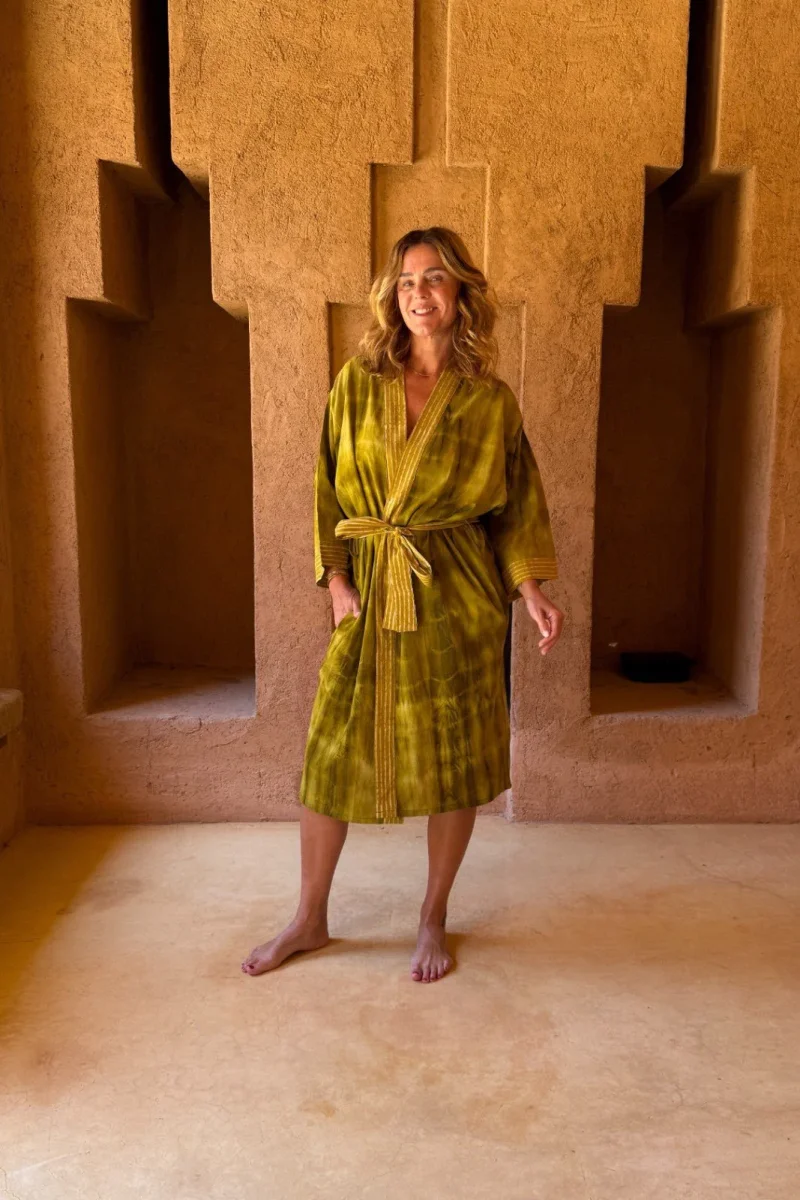 Notre Kimono iconique, 100% coton indien, se pare de douces couleurs naturelles en tie-and-dye pour l’été.