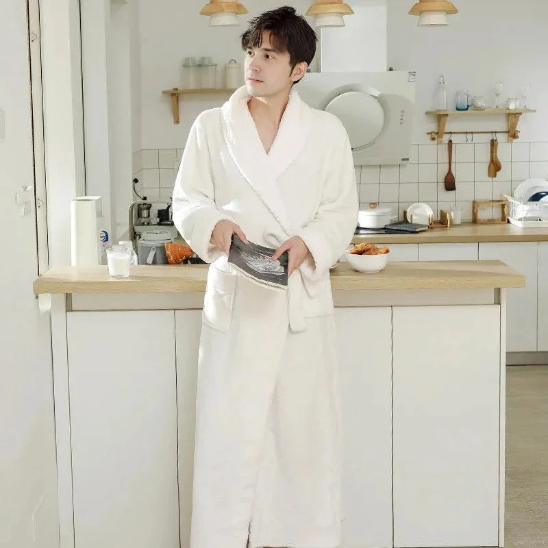Peignoir Blanc Polaire Homme – Col Châle et Ceinture