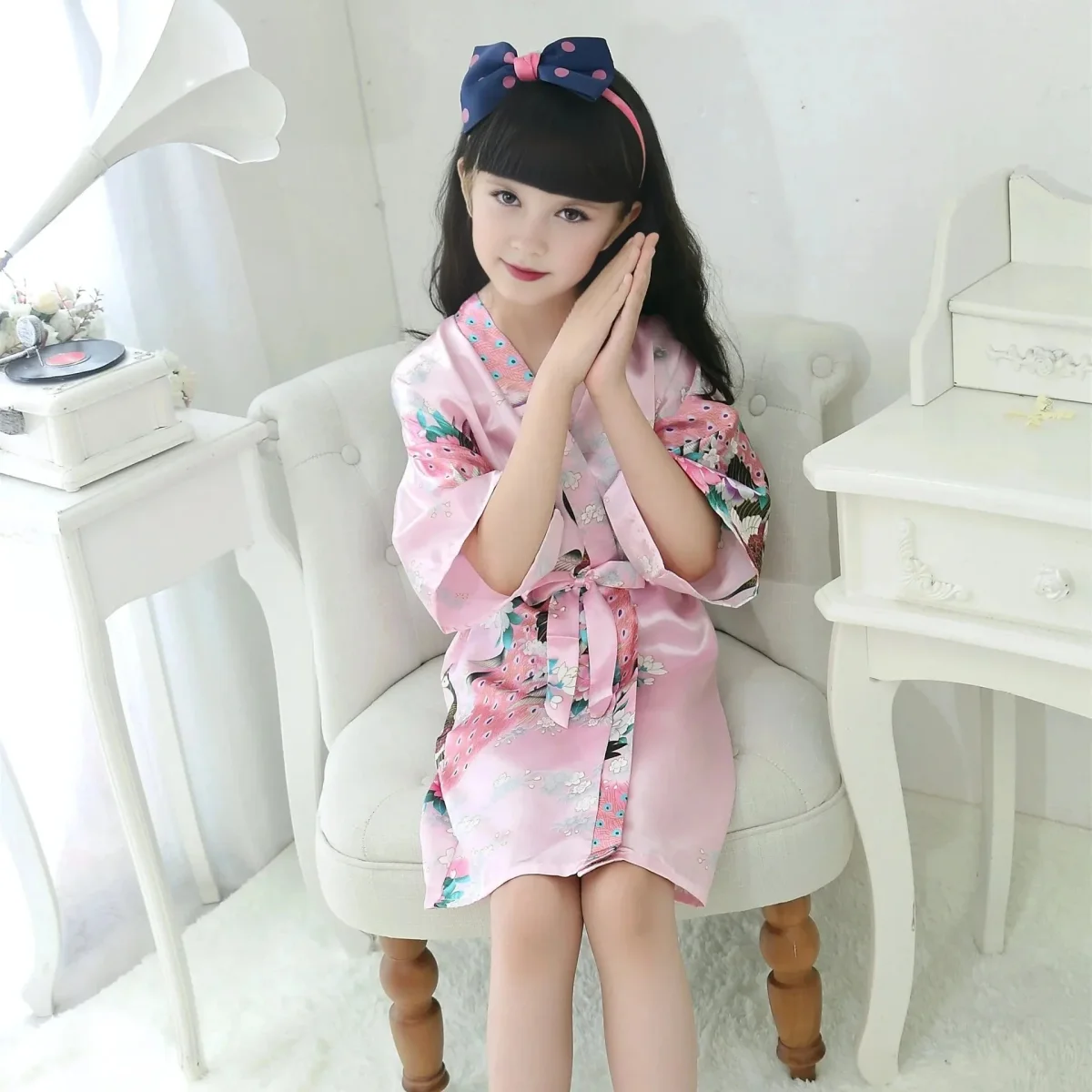 Peignoir Enfant Rose Satiné Motif Paon et Fleurs