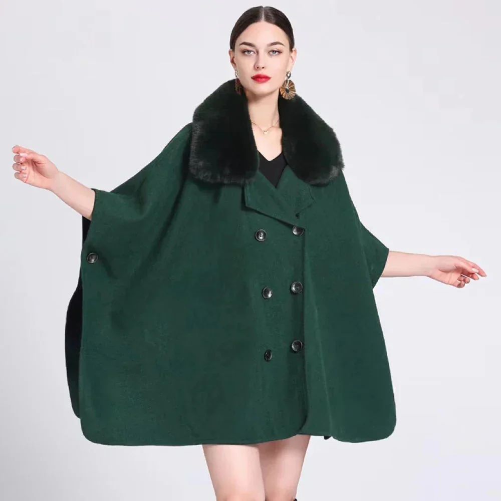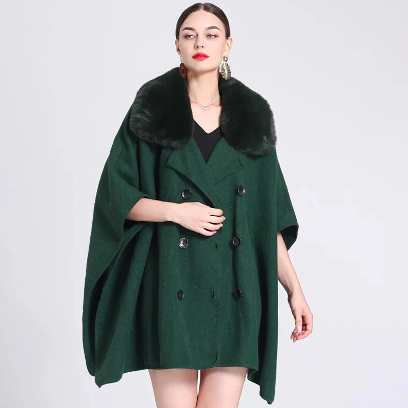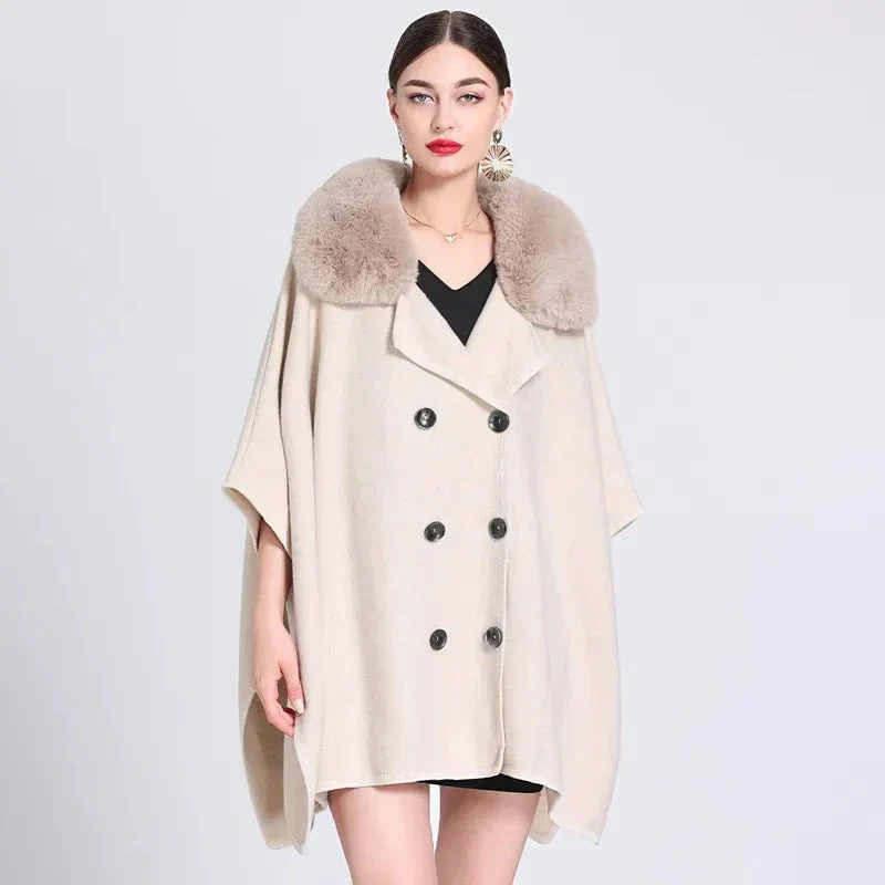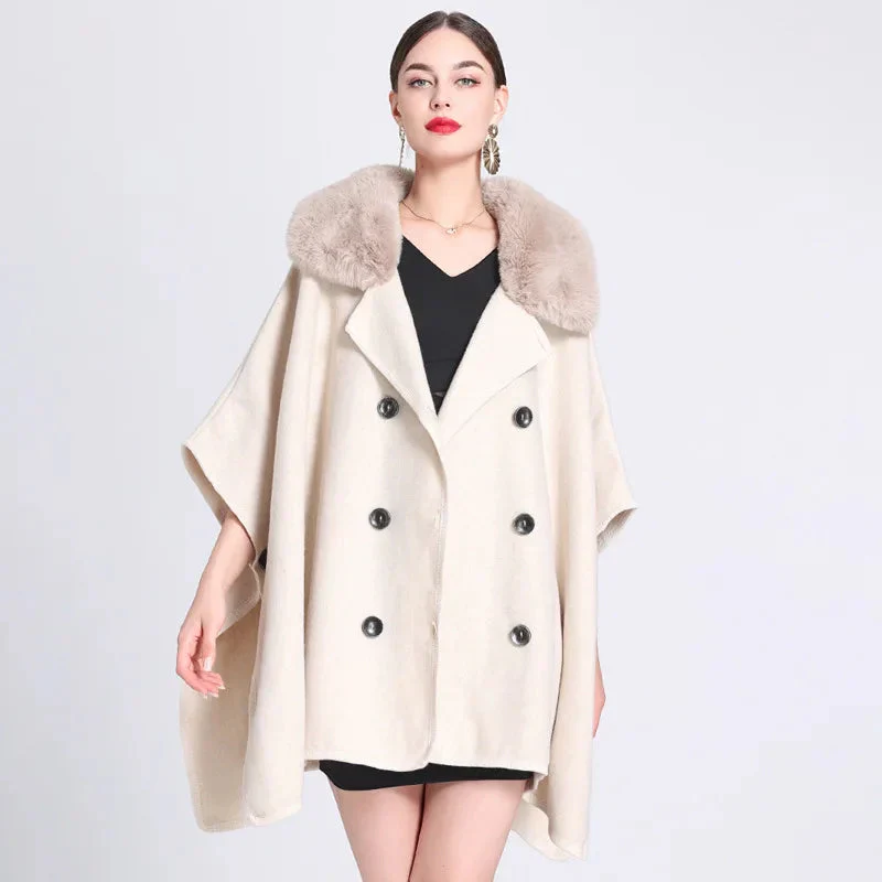 Poncho élégant à double rangée de boutons et col en fausse fourrure