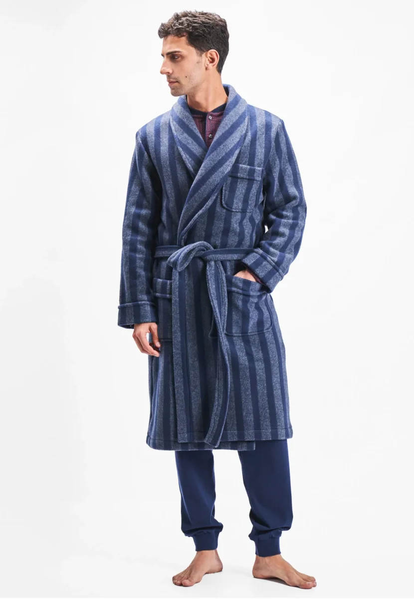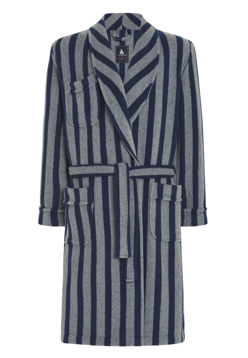 Bata premium a rayas de manga larga ideal para el frío invierno de tejido Forro Polar, 100% poliéster. Marca « PRODIGY », hecho en Portugal. Color gris y marino. Bata abrigada y agradable al tacto que otorga una calidez extraordinaria, apta para las estancias más frías. Posee un cinturón que sirve para ajustar a la cintura. Con bolsillo en el pecho y otros dos a ambos lados de la cadera.