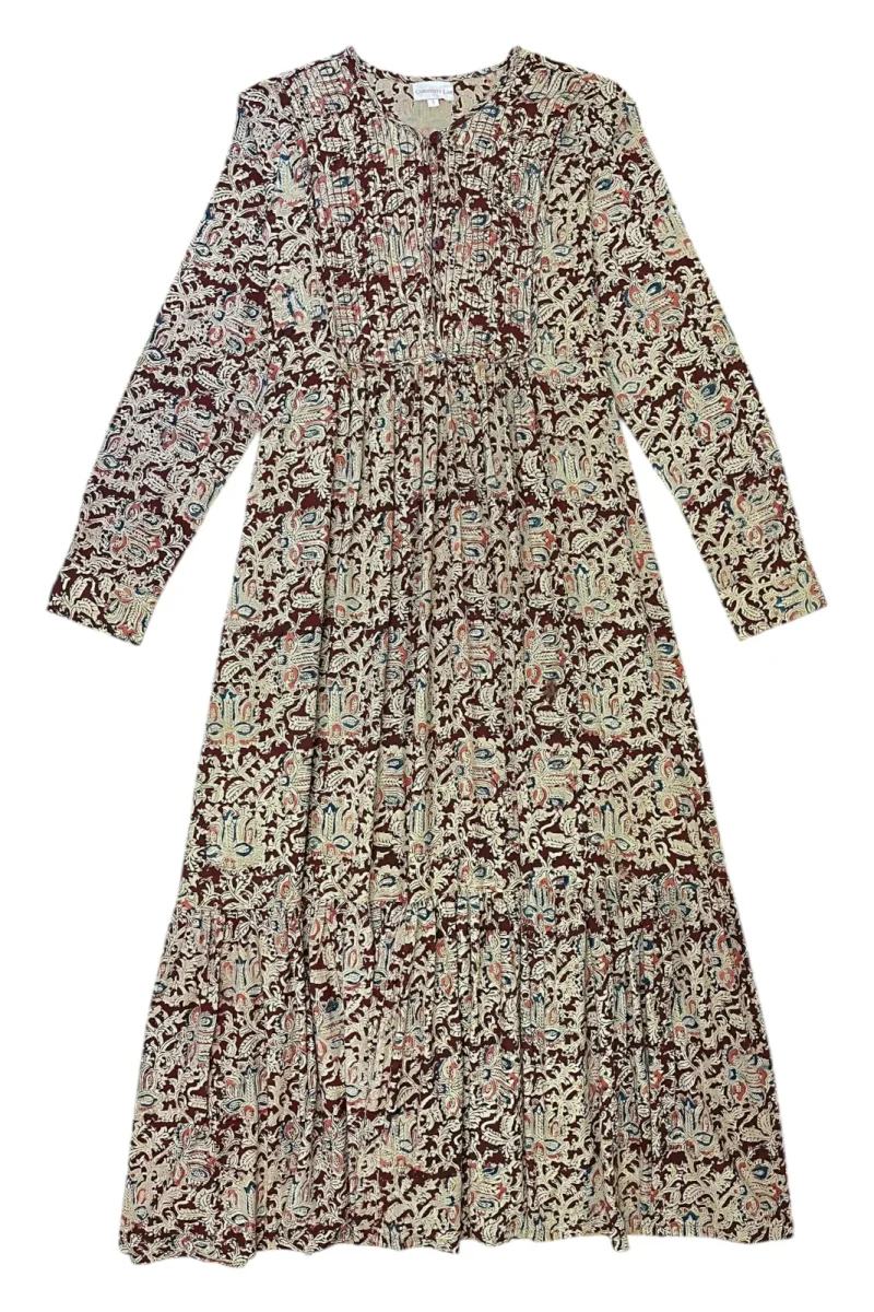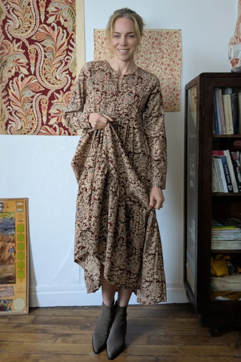 Robe longue, manches longues, plissée à la taille, poches plaquées.