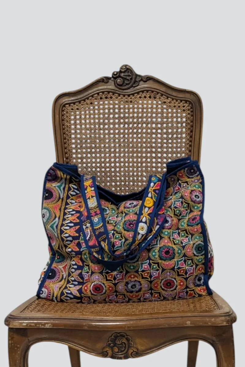 Découvrez le charme unique de notre sac en coton, conçu à partir de chutes de tissus traditionnels du Gujarat. Chaque pièce est soigneusement sélectionnée pour créer un patchwork de couleurs vives et de motifs artisanaux.