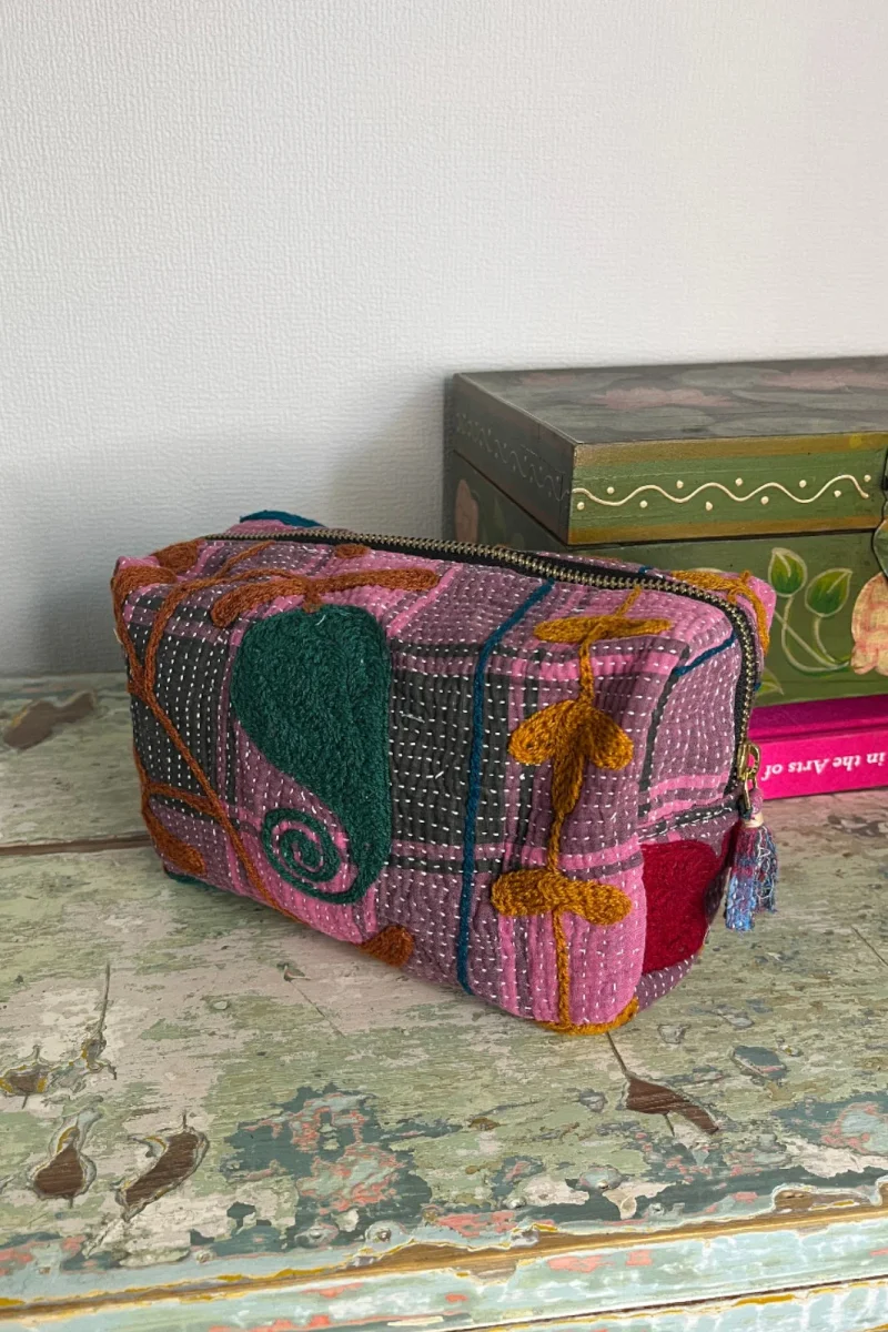 Entièrement doublée en toile de parachute, cette trousse de toilette ronde apporte une touche de gaieté à votre quotidien. Confectionnée à la main selon la technique traditionnelle du Kantha, puis rebrodée de motifs colorés, chaque pièce est unique et raconte sa propre histoire.