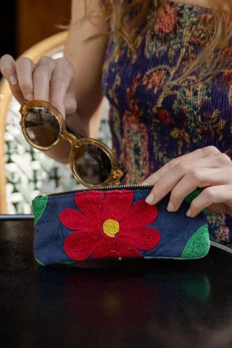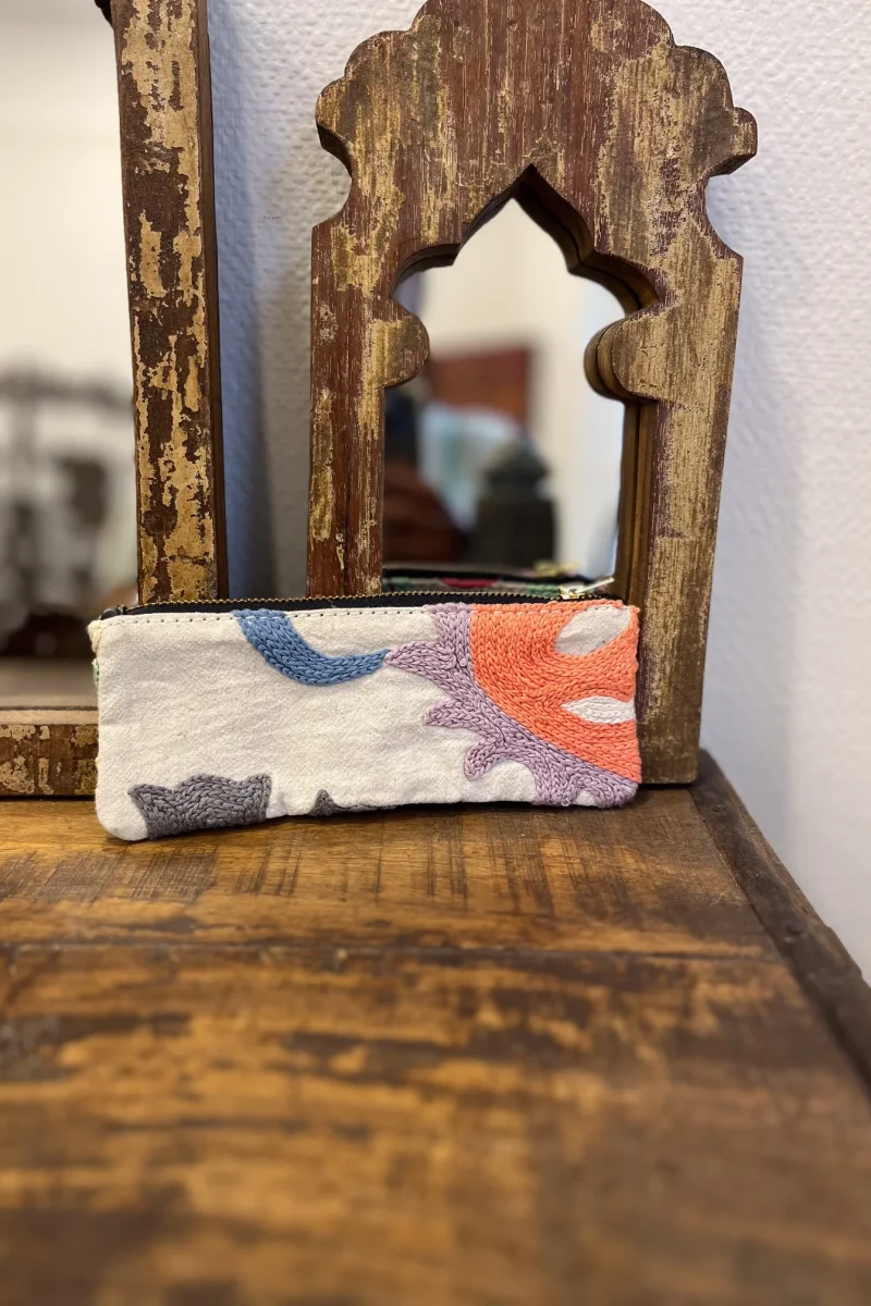 Nos trousses sont fabriquées en suzani : technique traditionnelle de broderie faite à la main.