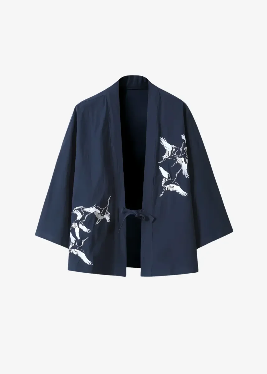 Veste Kimono Homme Coton Bleu avec Motif Grues