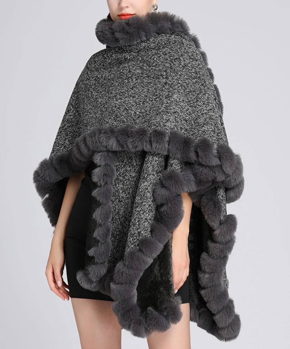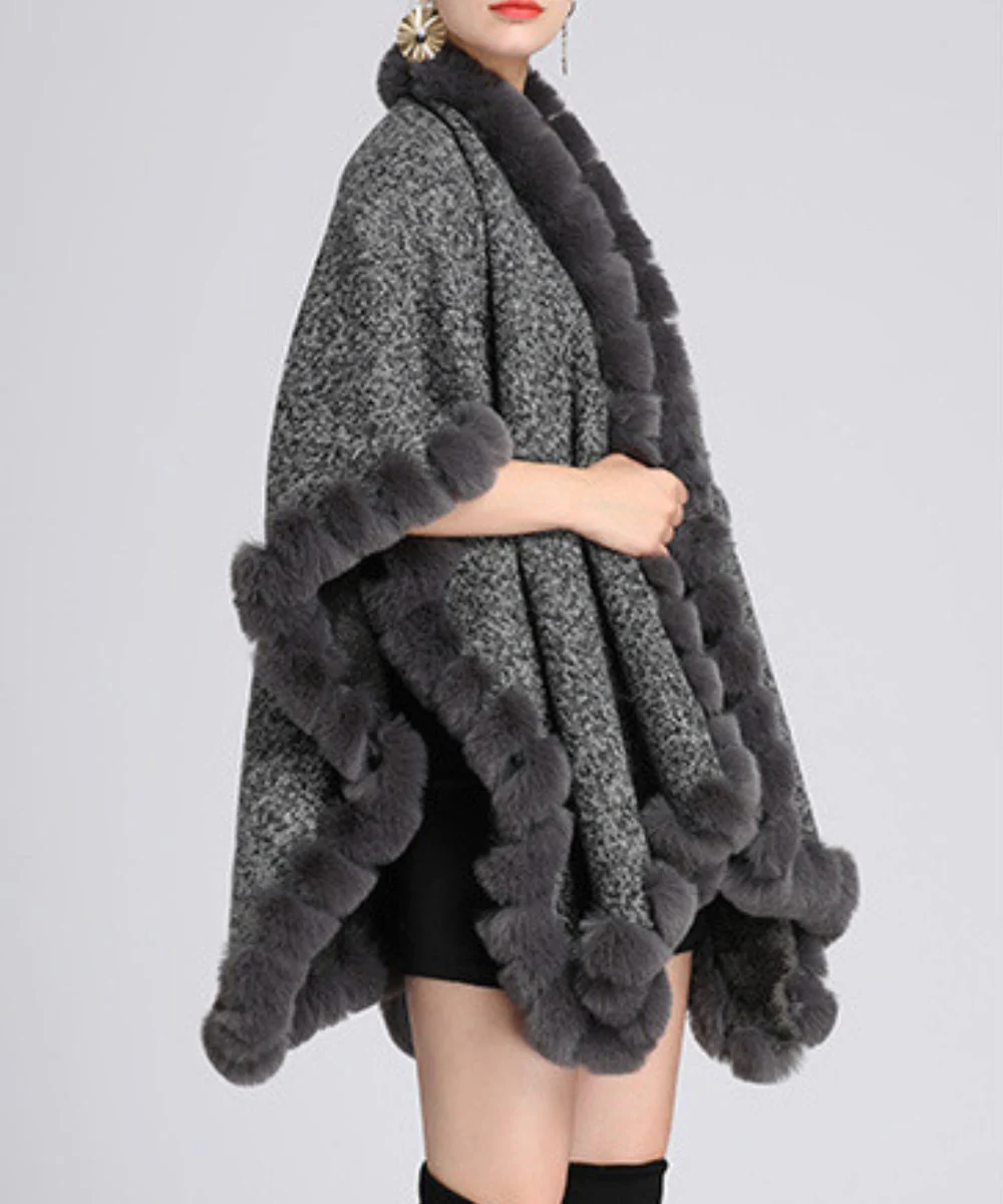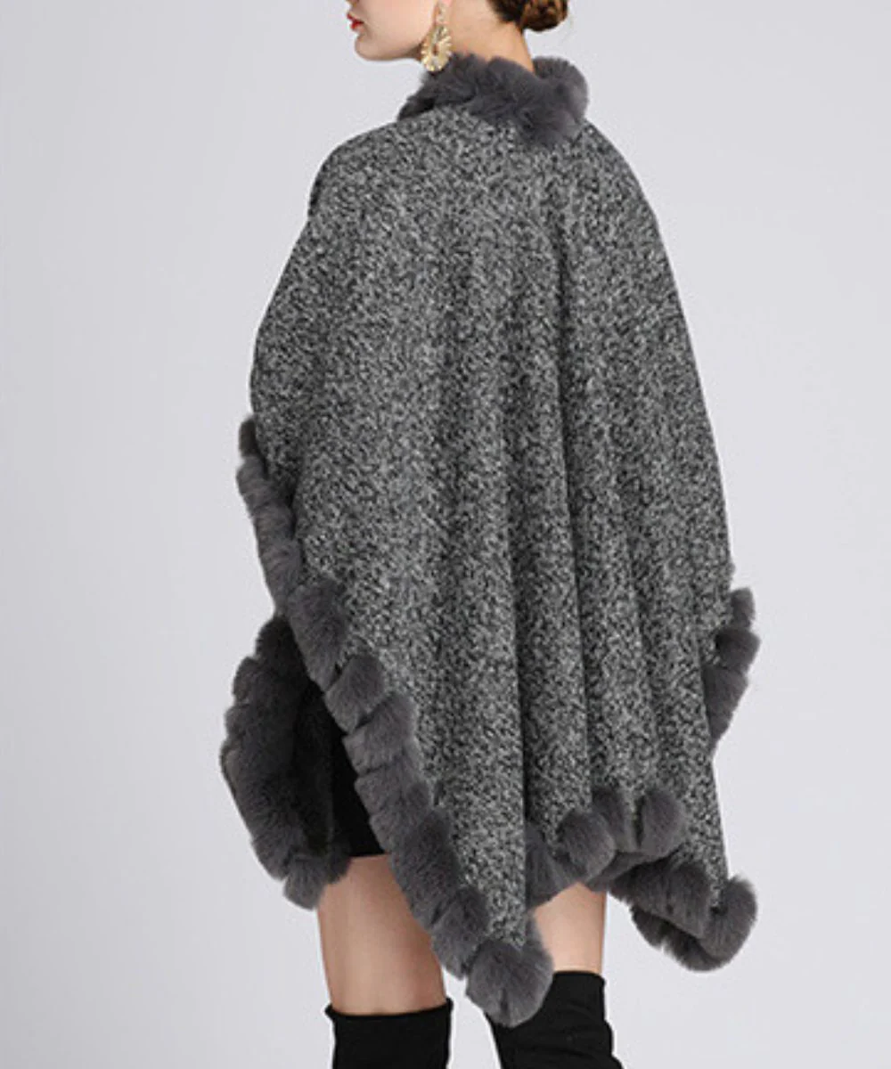 La veste poncho femme hiver est un poncho chaud et réconfortant gris à motifs de fausse fourrure.