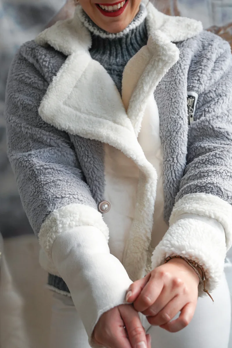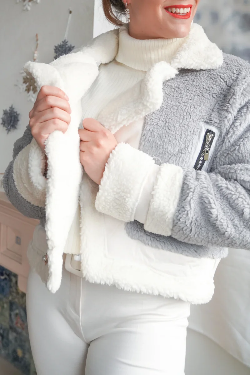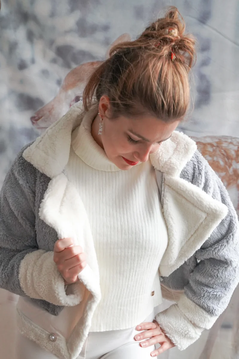 En petite et grande taille En teddy bi-color Fermeture par 2 boutons en nacre Légère, chaude, extra douce Existe en noir et blanc
